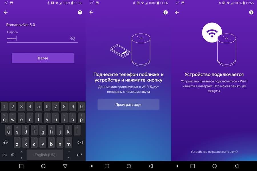Вводим пароль, подносим телефон к устройству — с помощью весьма неприятного писка настройки передаются колонке.