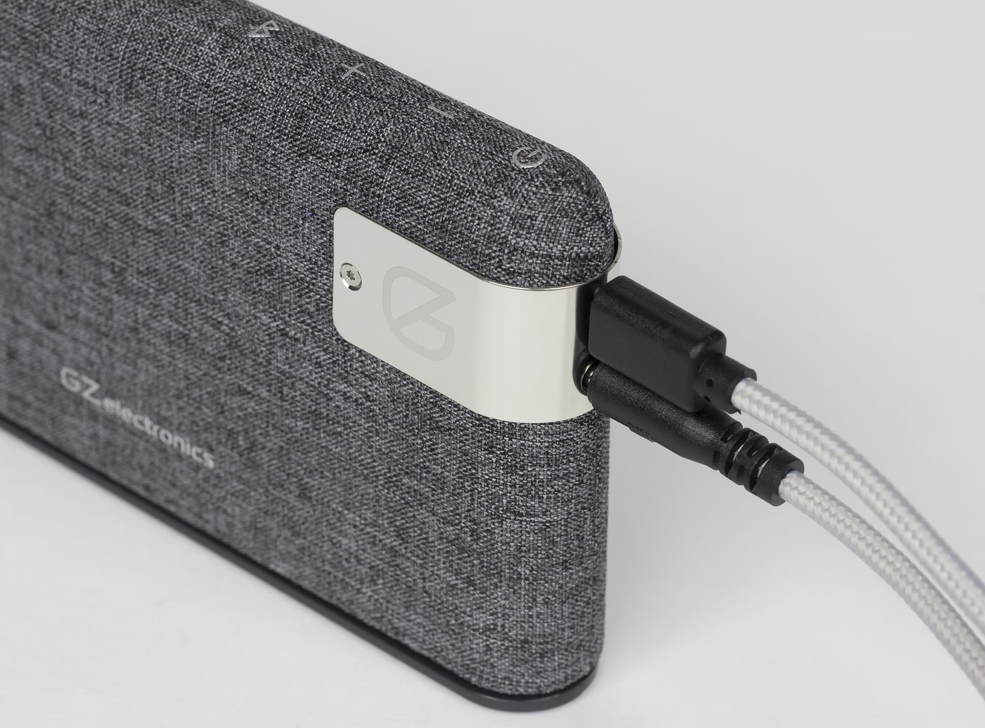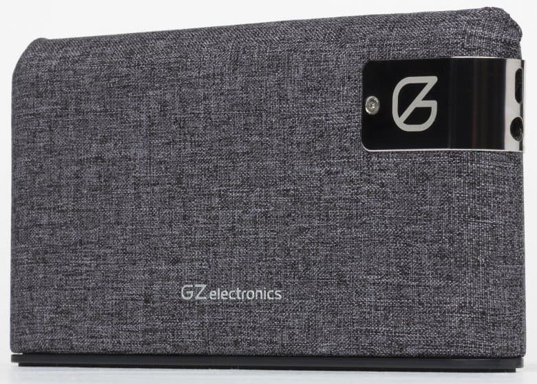 Устройство имеет форму параллелепипеда с тремя скругленными гранями, обшивка колонки выполнена из плотной серой ткани. На фронтальной поверхности расположены два 40-миллиметровых динамика (под слоем ткани) мощностью 5 Вт каждый, в нижней части нанесено название компании, а на металлической плашке, обрамляющей разъемы, расположенные на правой грани, выгравирован логотип GZ electronics.