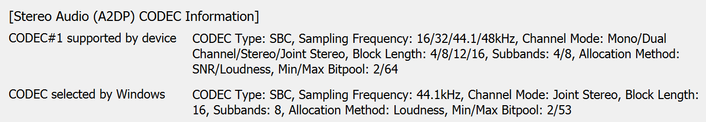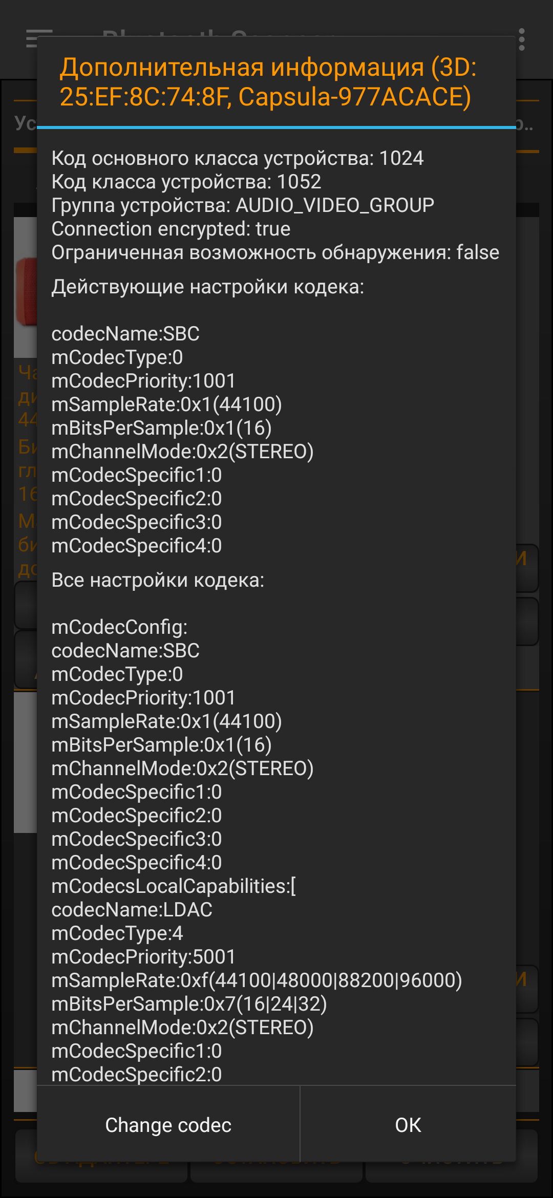 Одновременное соединение с несколькими устройствам по Bluetooth «Капсула» не поддерживает, что было проверено попыткой параллельного подключения ее к смартфону и ПК под управлением Windows 10. После отключения от смартфона подключение к ПК прошло без проблем, заодно мы получили полный список поддерживаемых кодеков и их режимов с помощью утилиты Bluetooth Tweaker. Особого разнообразия тут не наблюдается: SBC, да и только.