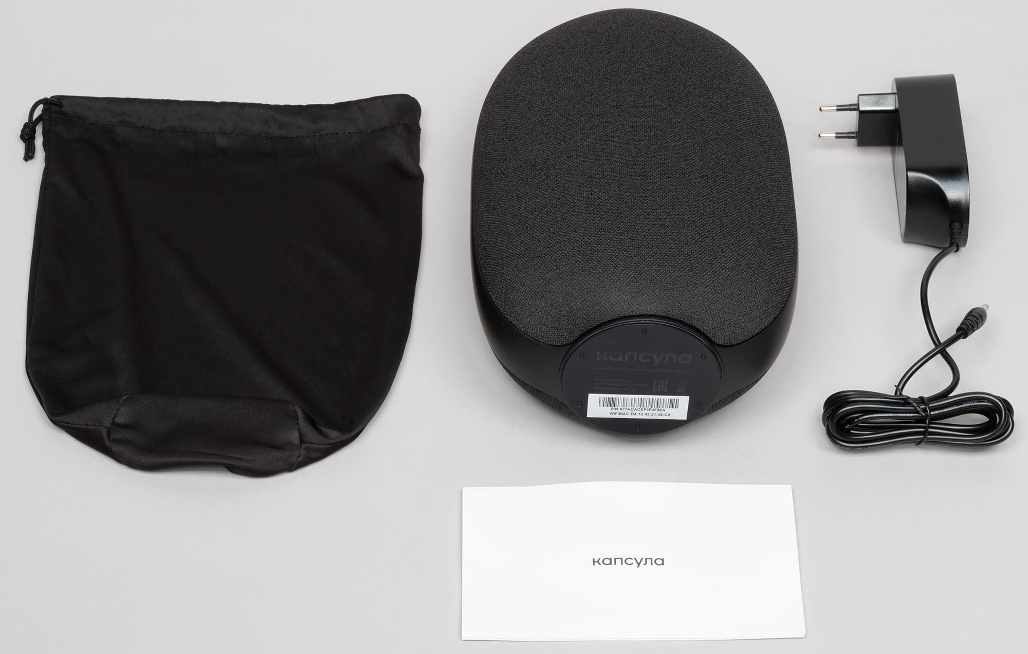 В комплект входит сама колонка, уже упомянутый тканевый мешок для нее, документация и блок питания. Плюс «нематериальная часть»: подписка на стриминг музыки «ВКонтакте» длительностью в 6 месяцев.