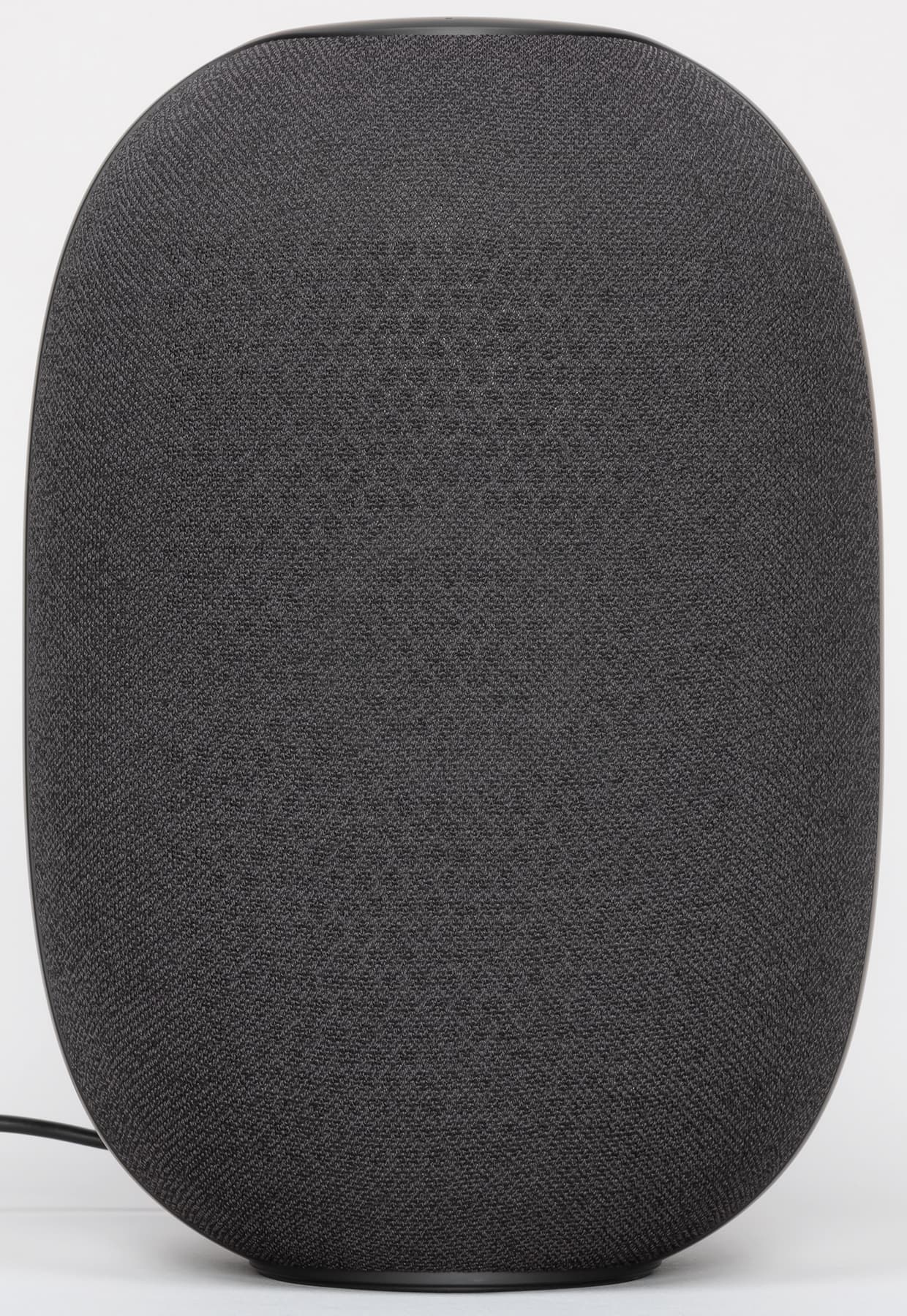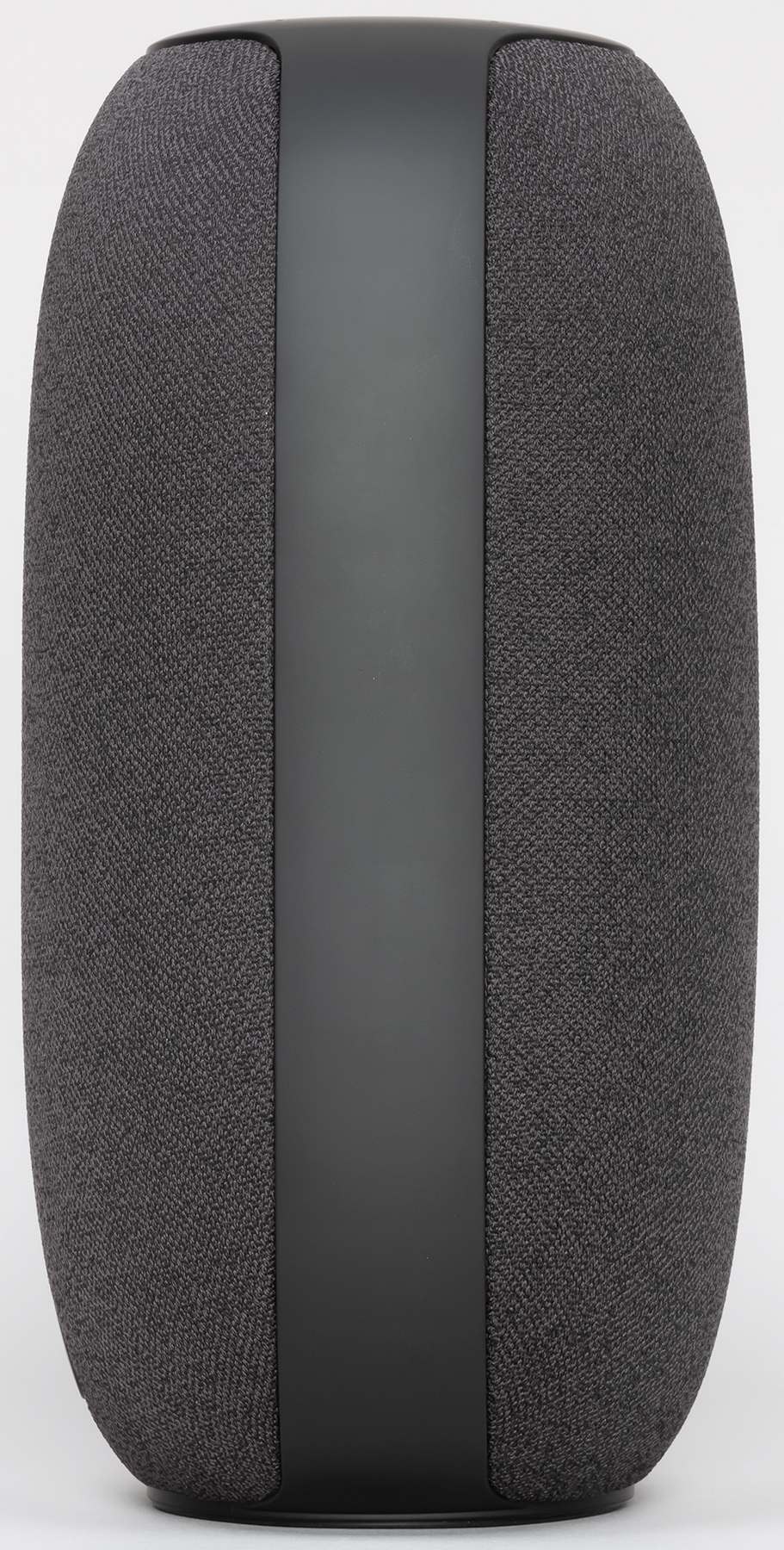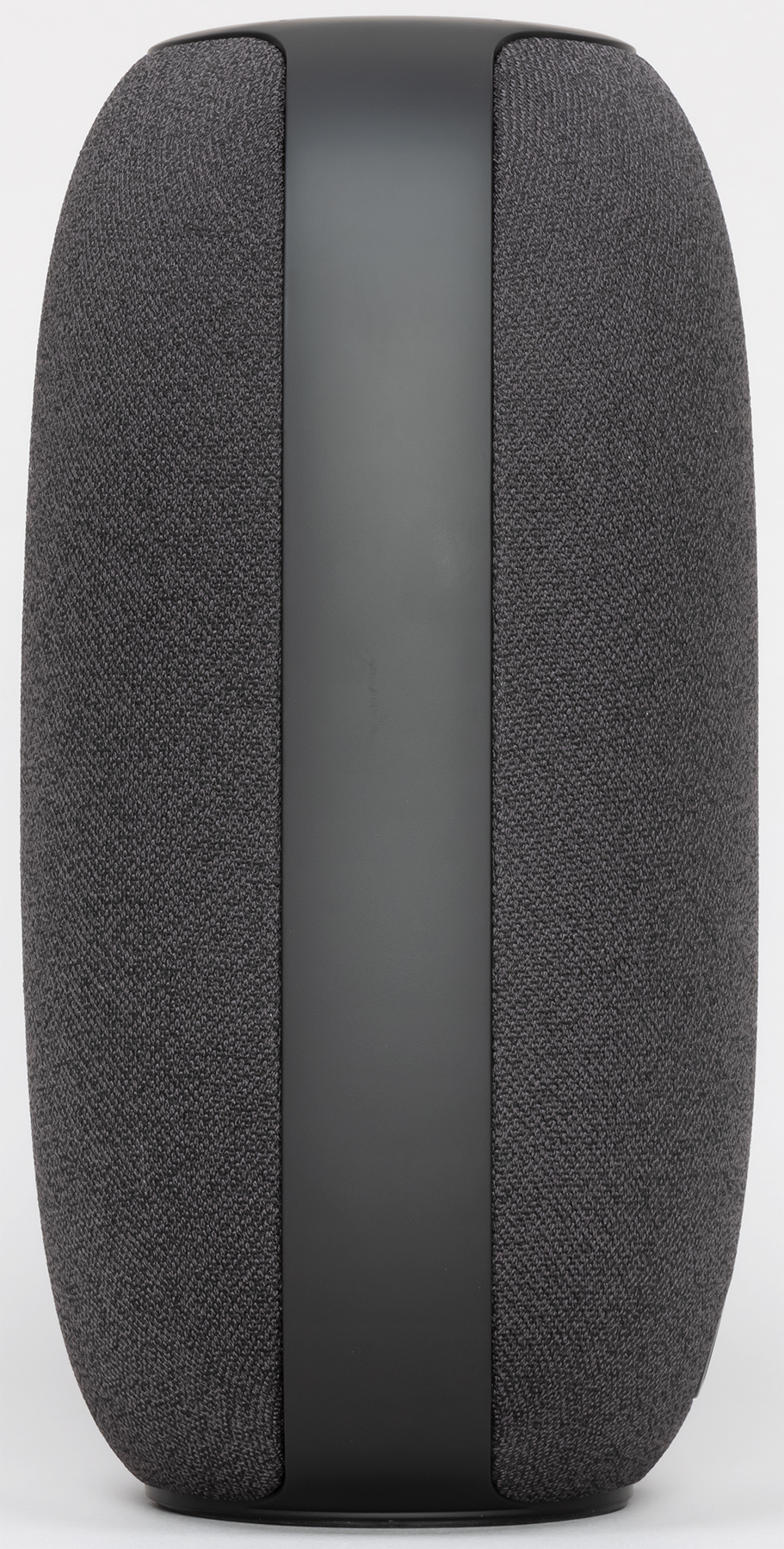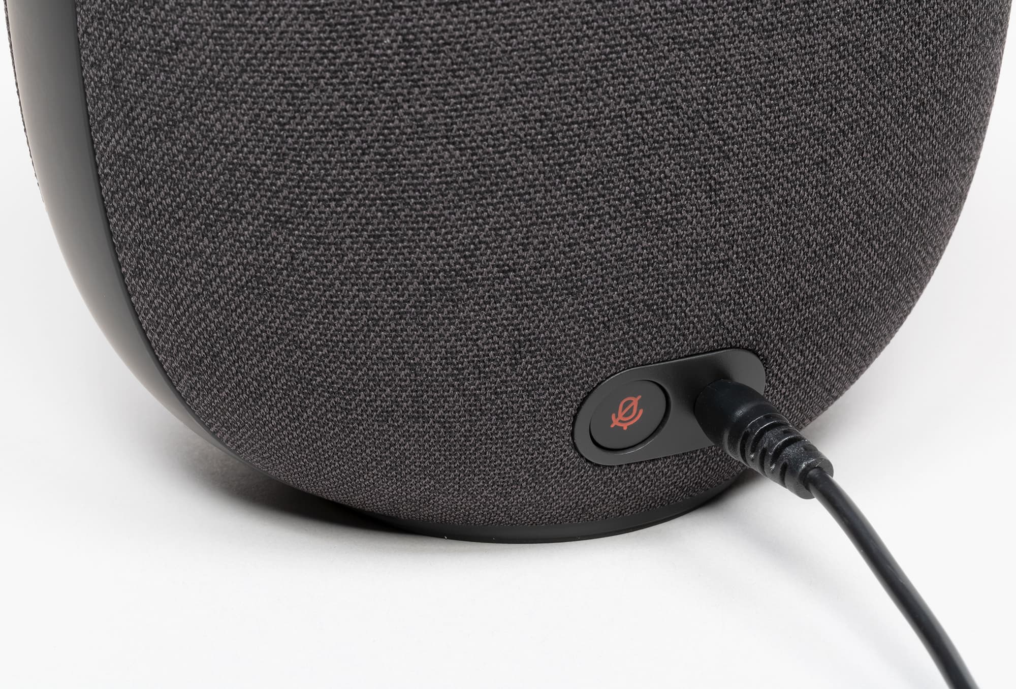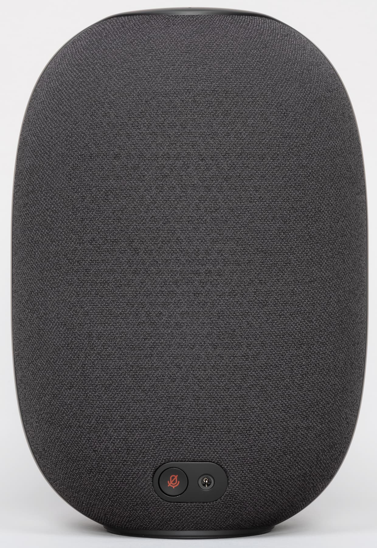 Динамики не видны, под тканью едва различима лишь защищающая их решетка, но из описания производителя мы знаем, что внутри находятся высокочастотный драйвер мощностью 5 Вт, низкочастотный на 25 Вт и один пассивный излучатель диаметром 82 мм. Отключение микрофона происходит на аппаратном уровне: кнопка рядом с разъемом питания «утапливается» в корпус с ощутимым щелчком.