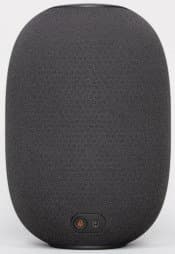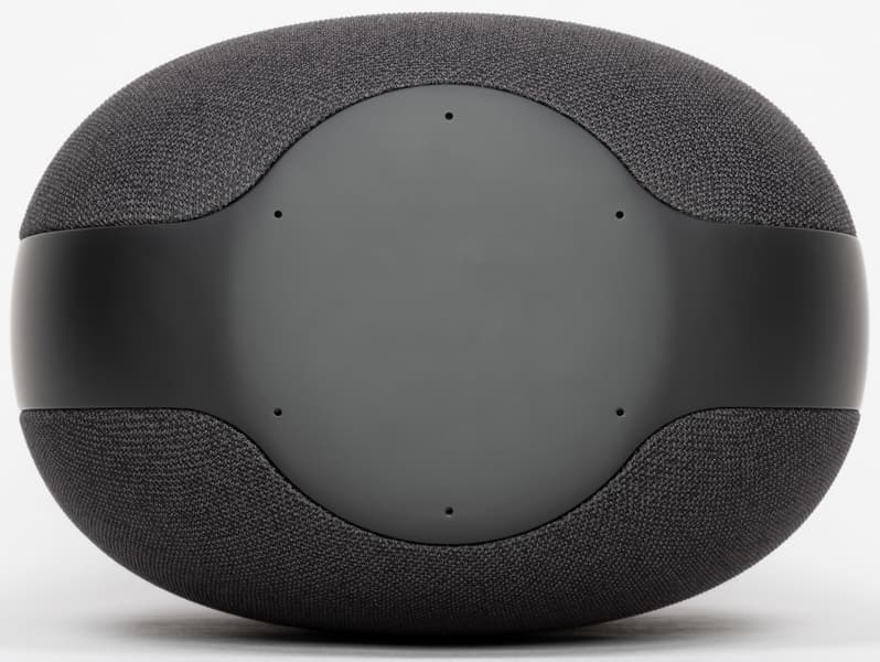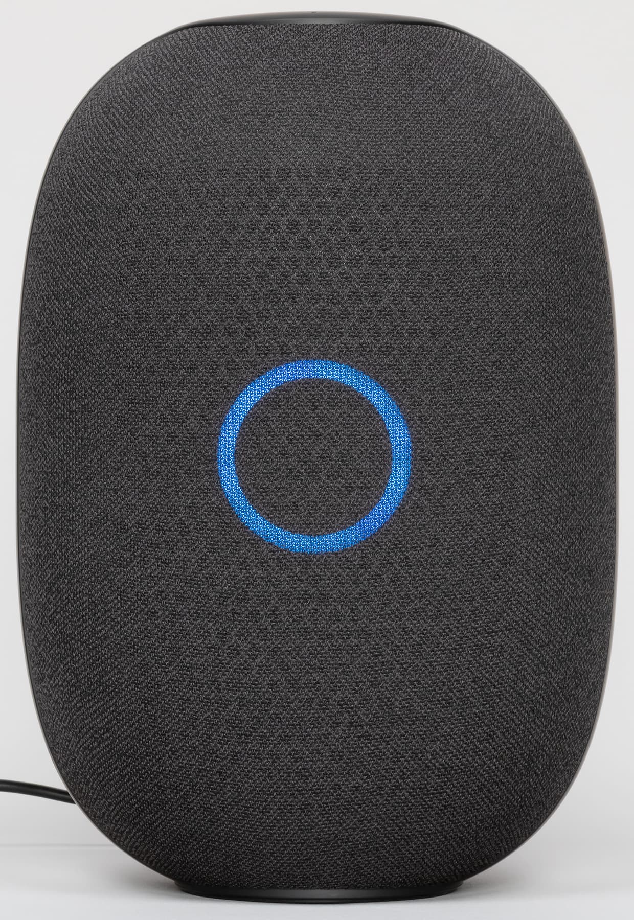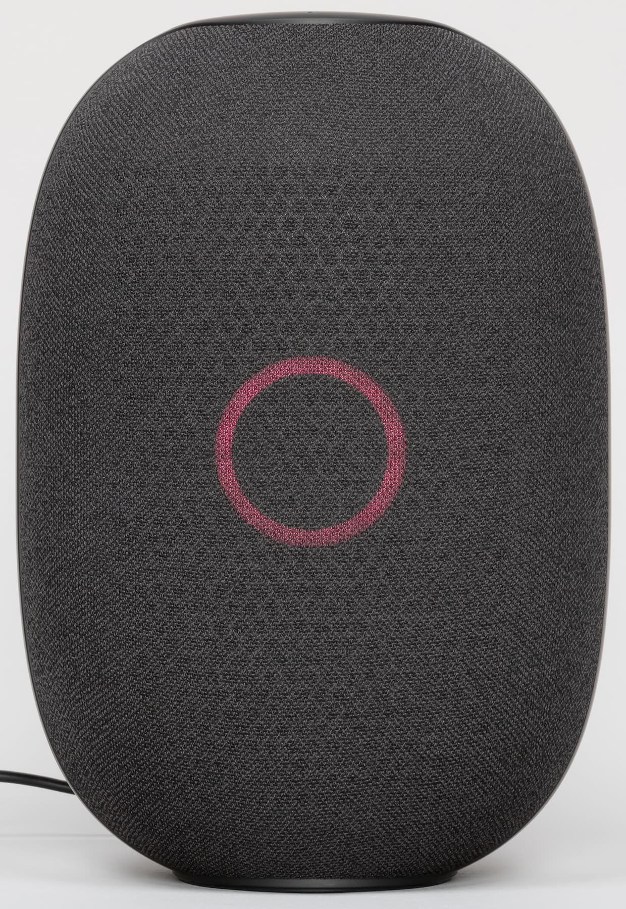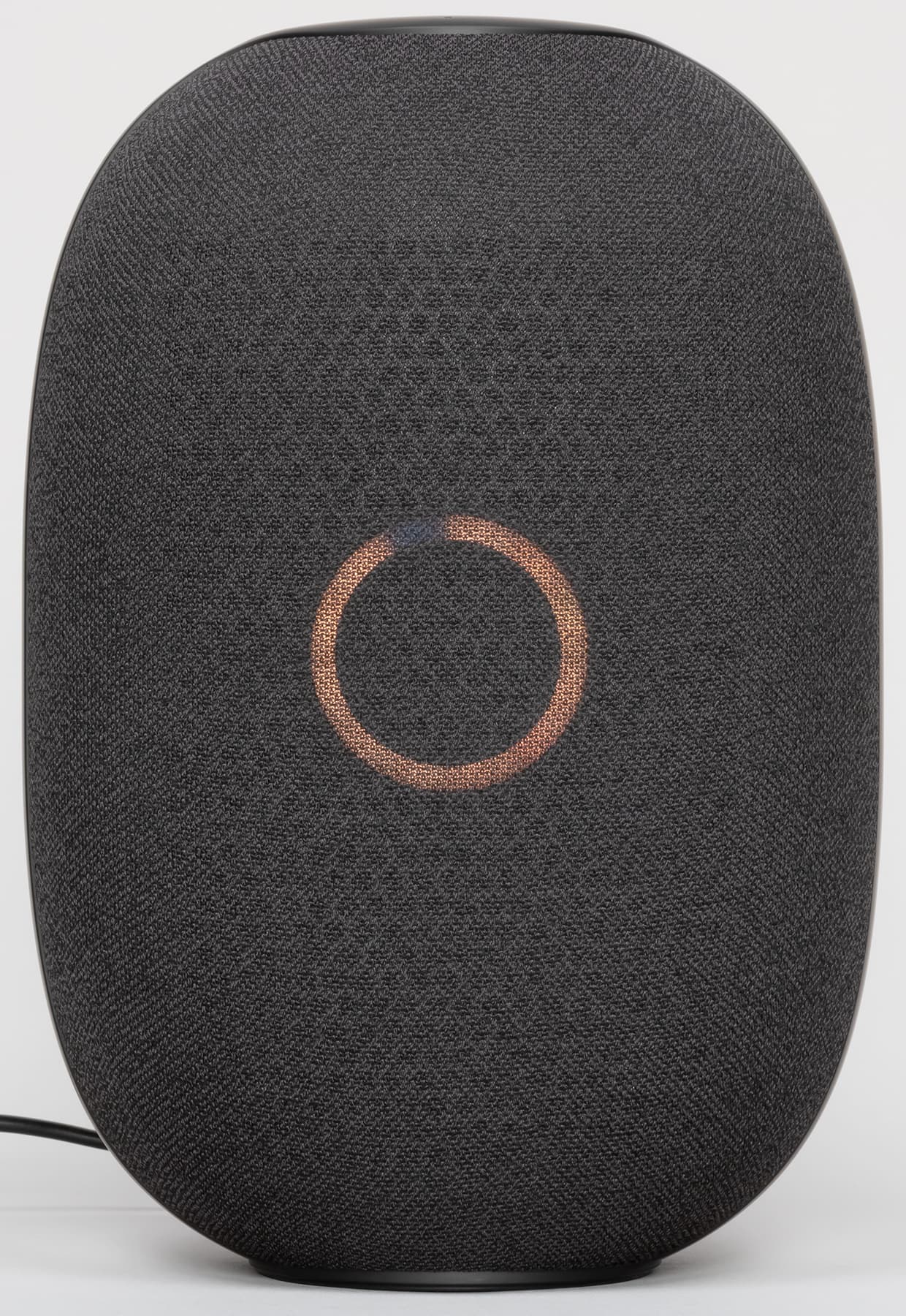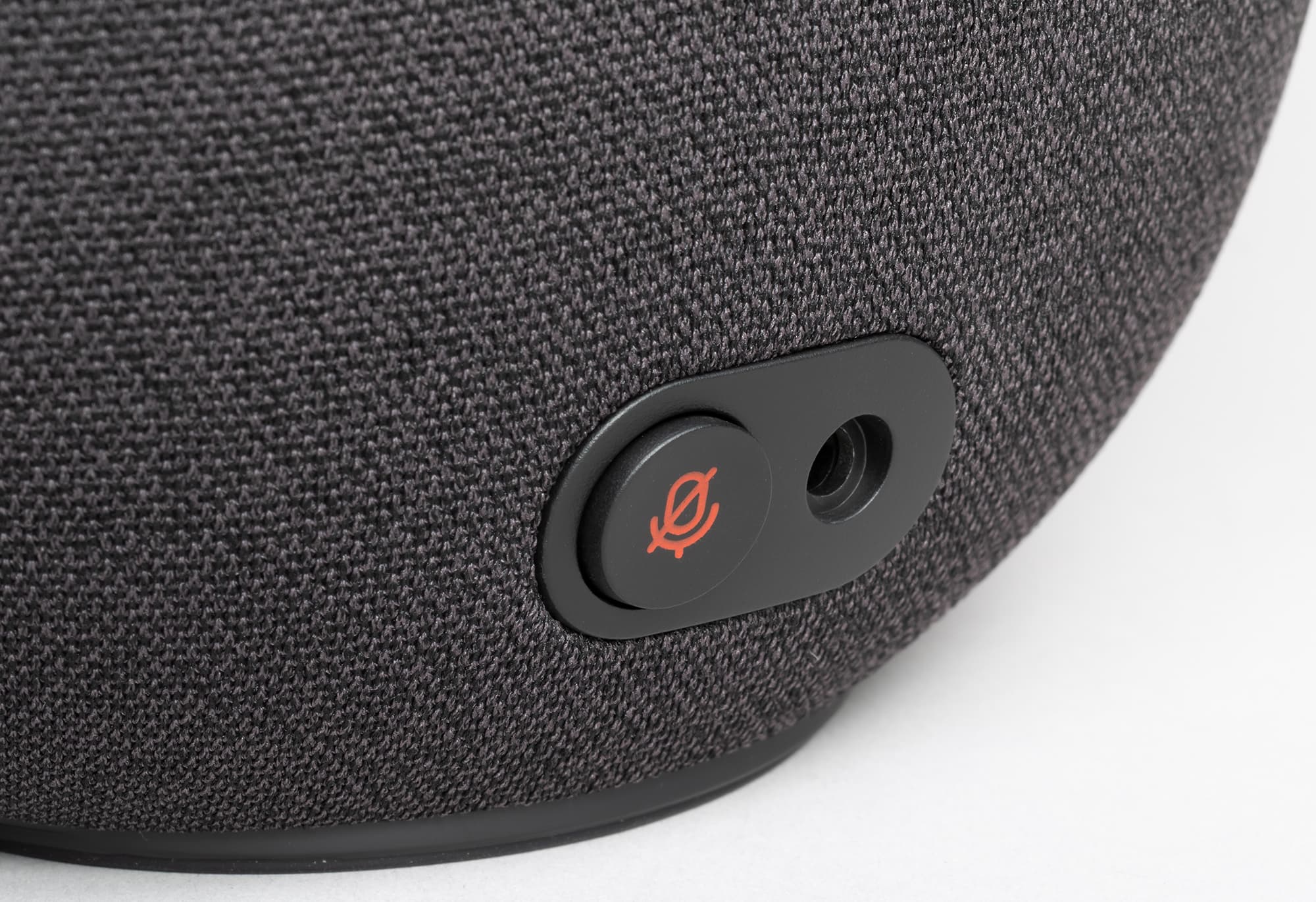 Динамики не видны, под тканью едва различима лишь защищающая их решетка, но из описания производителя мы знаем, что внутри находятся высокочастотный драйвер мощностью 5 Вт, низкочастотный на 25 Вт и один пассивный излучатель диаметром 82 мм. Отключение микрофона происходит на аппаратном уровне: кнопка рядом с разъемом питания «утапливается» в корпус с ощутимым щелчком.
