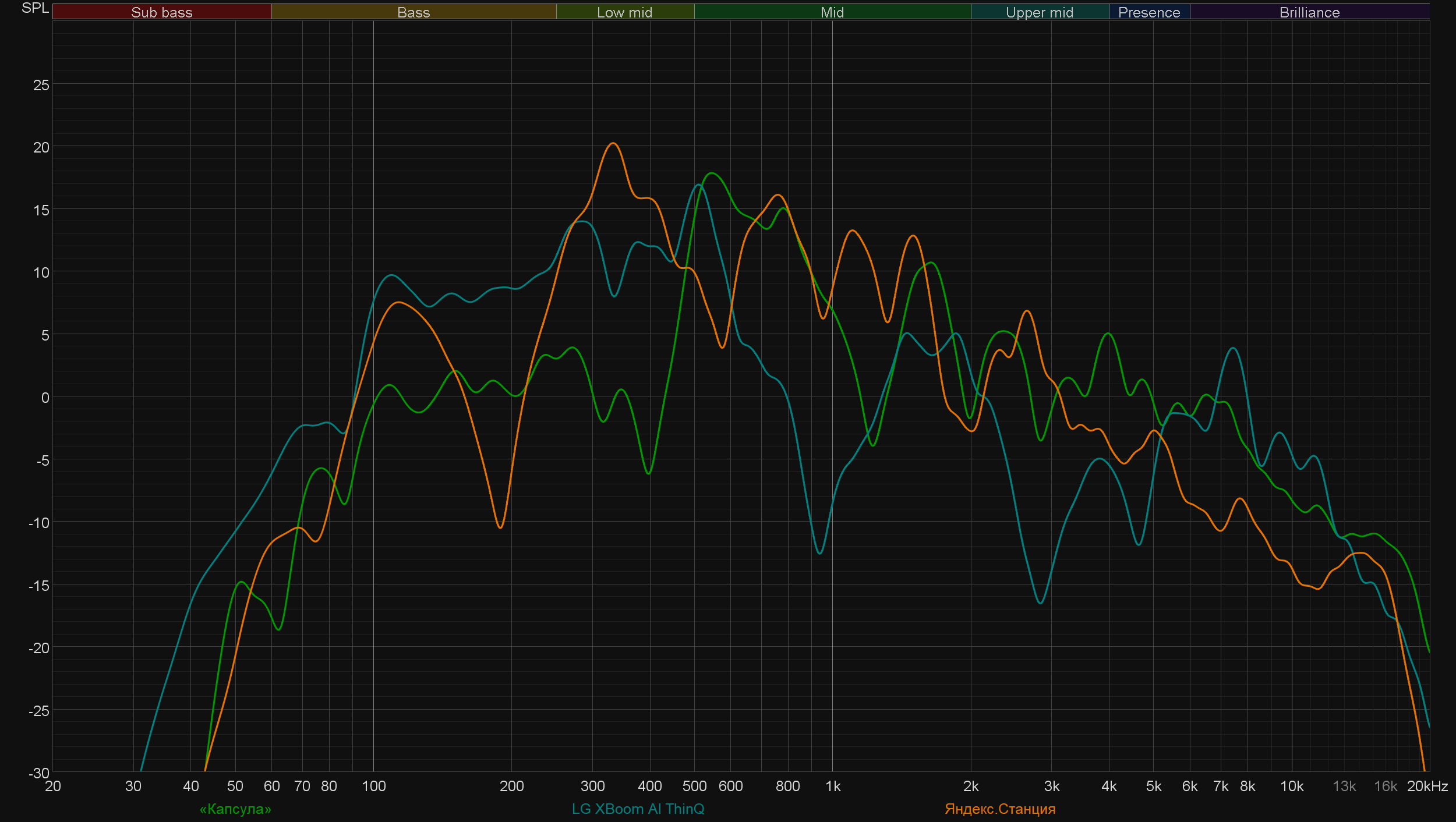 Конечно же, мы не могли не сравнить «Капсулу» с ближайшими конкурентами — «Яндекс.Станцией» и LG XBoom AI ThinQ. Своих особенностей, как можно заметить по графикам ниже, не лишена ни одна из колонок. В низкочастотном диапазоне «Капсула» заметно проигрывает «коллегам», в остальном же — дело вкуса. «Яндекс.Станция» крайне склонна к «бубнению» в НЧ, потому лидером по качеству звука мы бы назвали колонку LG. Но тут, опять-таки, все очень субъективно.