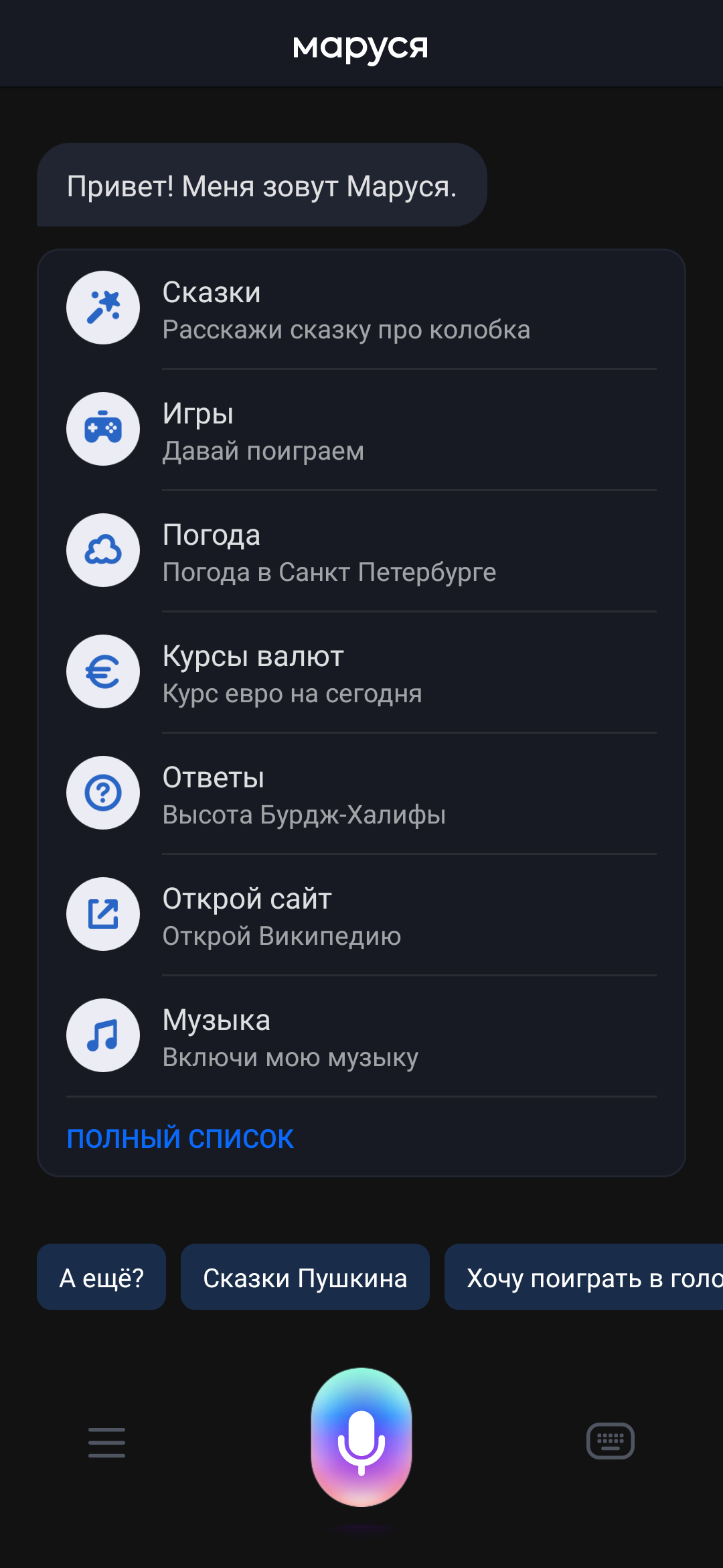 После первого включения питания Маруся начинает рассказывать о том, как подключить колонку к беспроводной сети. Первым делом, естественно, нужно скачать одноименное приложение, доступное под Android и iOS. Оно добавит на устройство возможность общаться с голосовым помощником Mail.ru, а заодно и настраивать «Капсулу». Устанавливаем, запускаем, после чего оказываемся в интерфейсе, позволяющем начать взаимодействие с Марусей непосредственно на используемом гаджете.