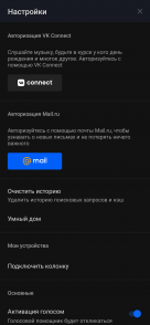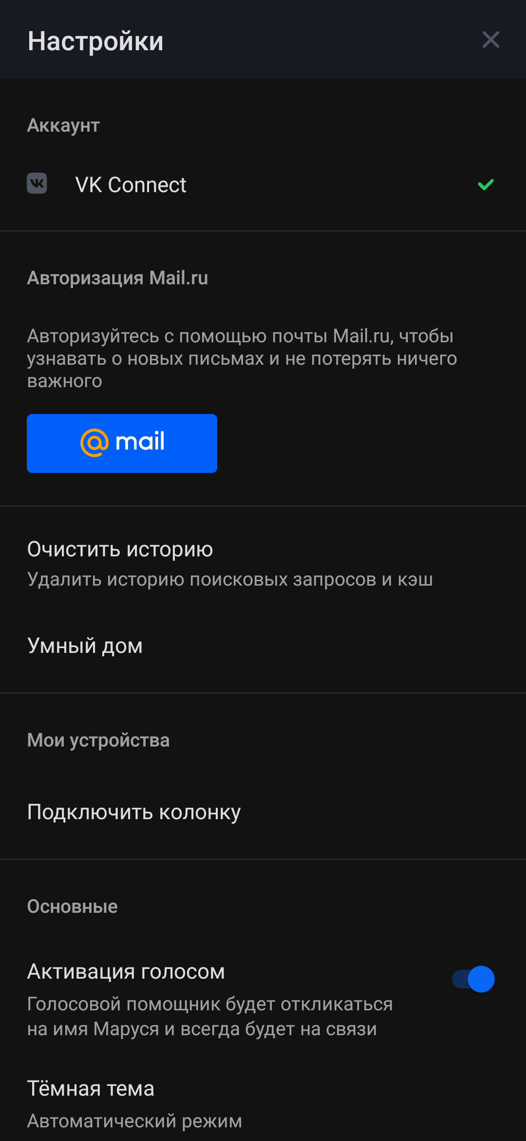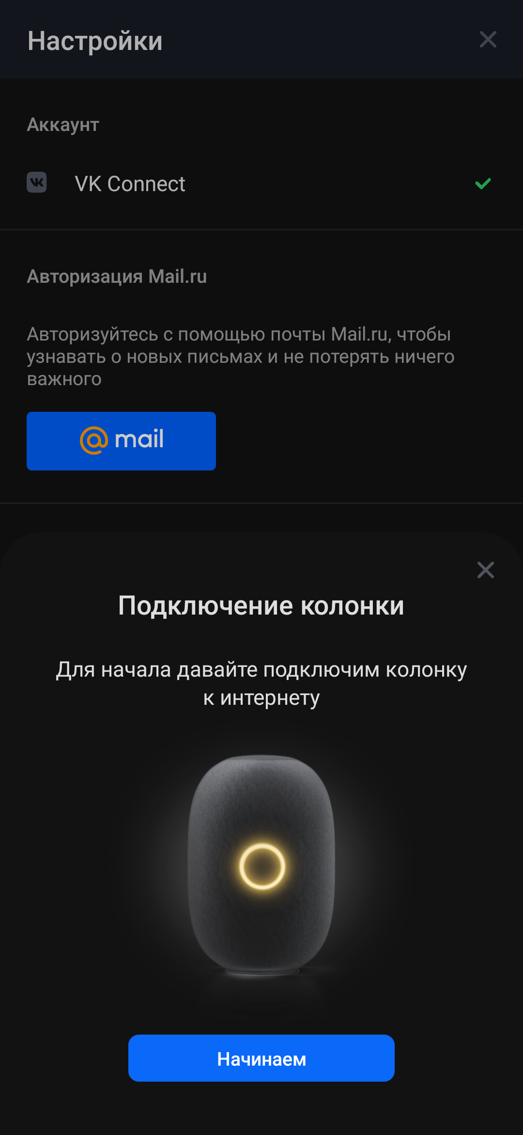 Но нас в данном случае интересует настройка колонки, потому переходим в меню с помощью кнопки слева от изображения микрофона в нижней части экрана. Первым делом нужно авторизоваться, вариантов тут два: с помощью аккаунта «ВКонтакте» или аккаунта Mail.ru. Для начала мы авторизовались с помощью ВК и попробовали подключить колонку — Маруся же в ответ сообщила, что для этого необходим и подключенный аккаунт Mail.ru. Пришлось завести — в конце концов, странно было бы пользоваться устройством компании и не иметь аккаунта на ее основном сайте. Позже у коллег получилось авторизоваться только через ВК.