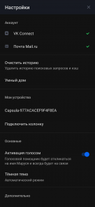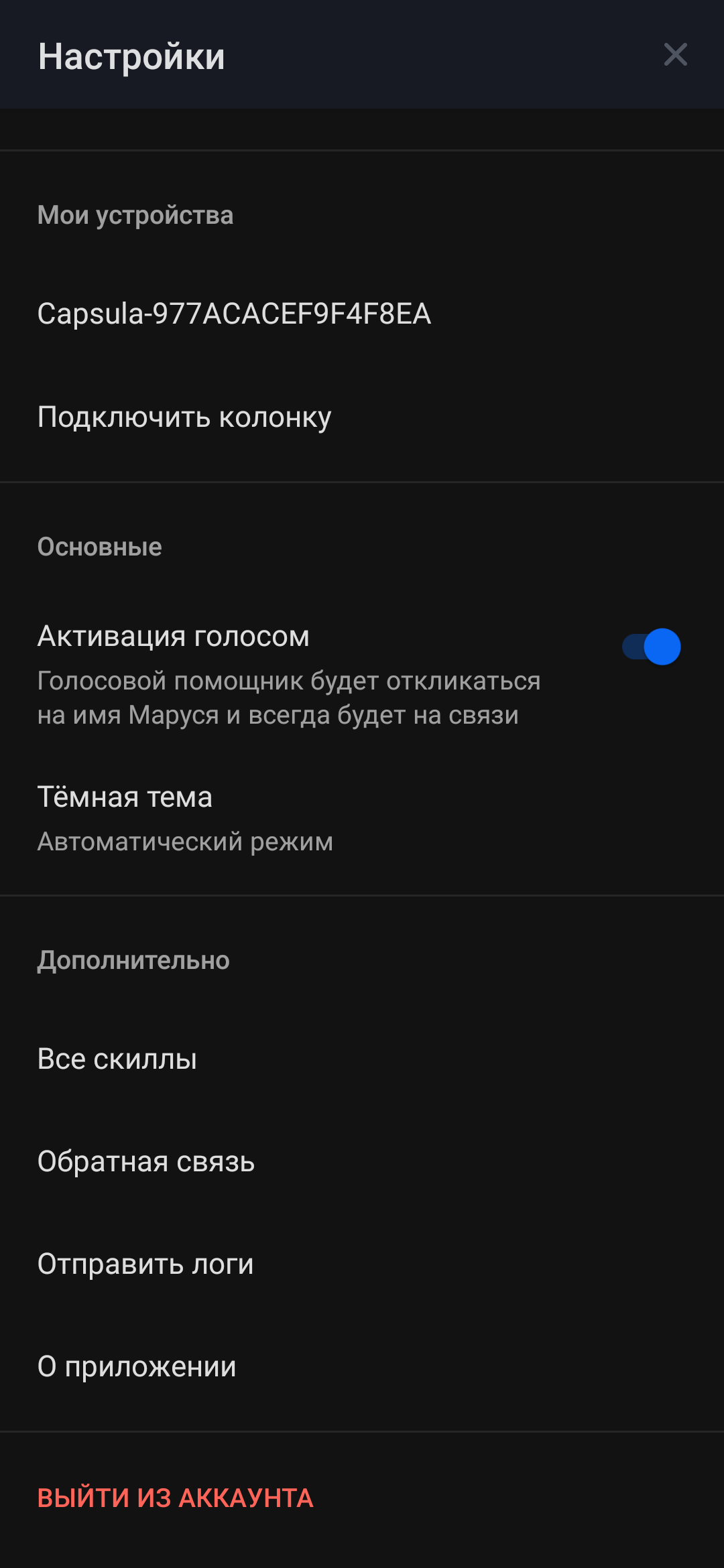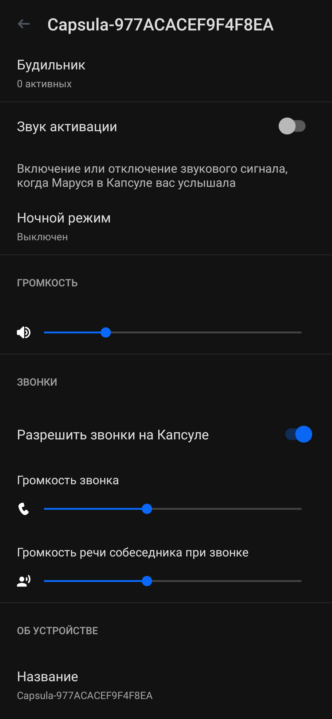 На вкладке настроек появились новые опции для работы с «Капсулой». В частности, оттуда можно настроить активацию голосом и подключить систему «умного дома». На странице «Все скиллы» собран список из основных команд, которые на данном этапе способна выполнить Маруся. По клику на имя колонки в меню открывается ее страница, откуда можно управлять громкостью, звонками, звуком активации и так далее.