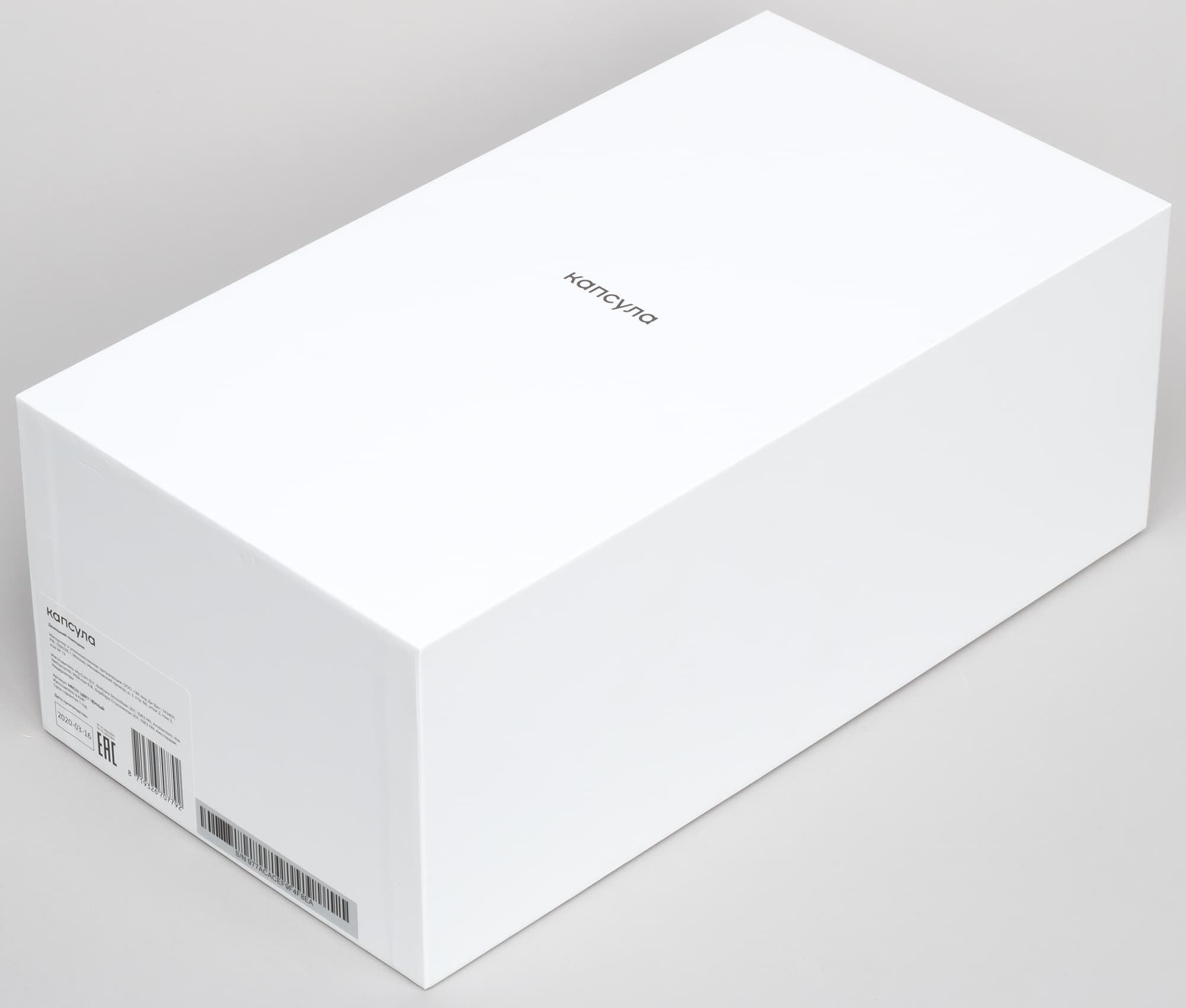 Поставляется колонка в довольно большой коробке с «суперобложкой», на которой размещены изображения устройства и краткая информация о возможностях голосового помощника. Внутри находится практически полностью белая коробка из плотного картона со съемной крышкой, в которой и размещено устройство. Все элементы комплектации надежно удерживаются пластиковыми ложементами, колонка дополнительно помещена в тканевый мешочек.