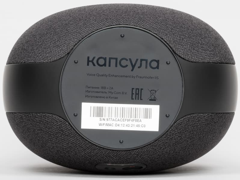На боковых гранях расположена пластиковая вставка, удерживающая тканевое покрытие. Лицевая и обратная стороны практически идентичны, отличия лишь в наличии индикатора на передней и порта для зарядки с кнопкой отключения микрофона — на задней. На первый взгляд, «Капсула» может показаться неустойчивой. Но в реальности для того, чтобы уронить ее, придется приложить довольно солидное усилие — при небольших толчках колонка начинает раскачиваться, но не падает.