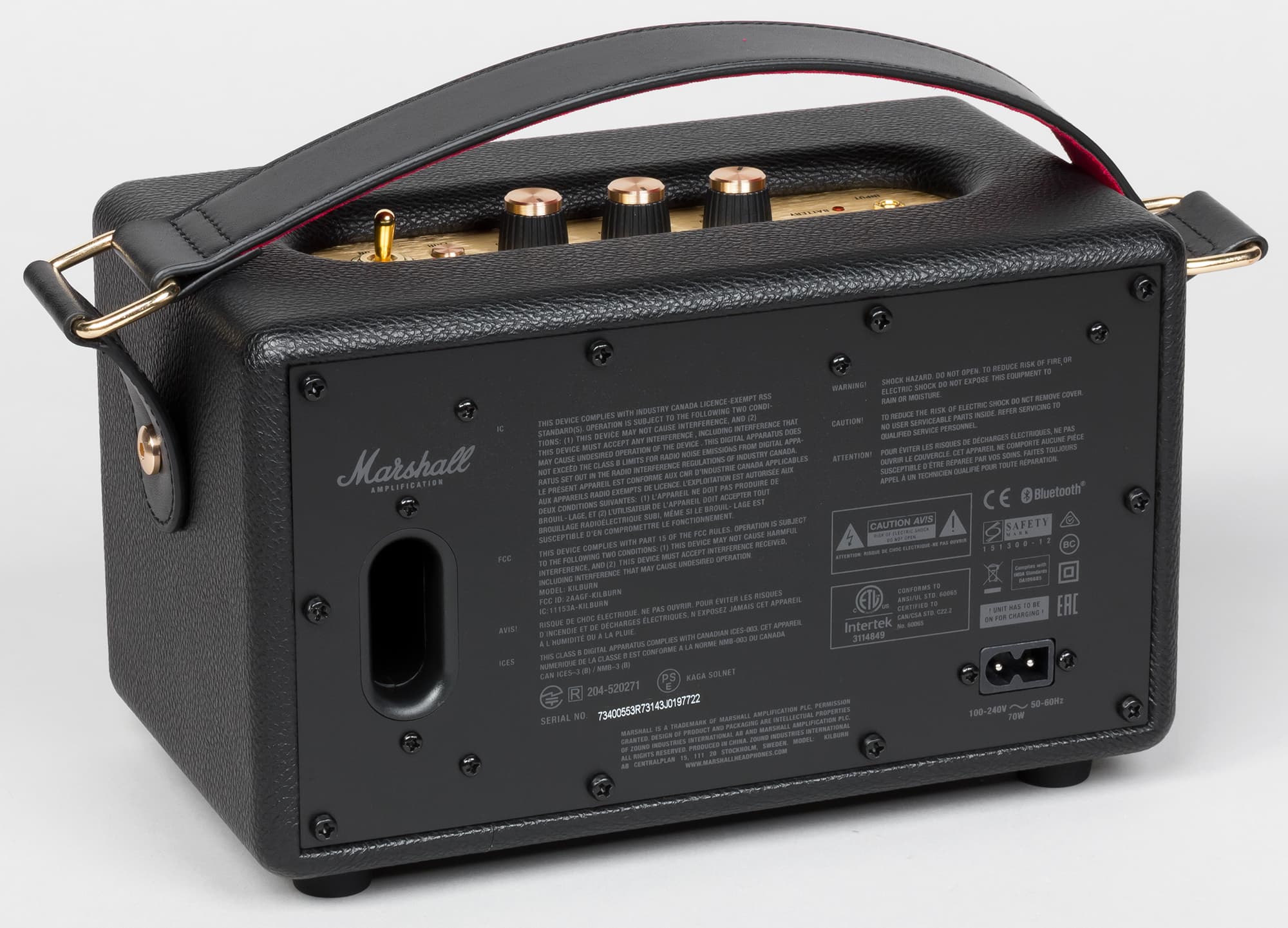 На тыльной стороне находится выход фазоинвертора и вход для кабеля питания. Блок питания у колонки встроенный. Задняя крышка является самым заметным отличием Marshall Kilburn от гитарных усилителей, имеющих, как правило, широкое окно в задней стенке.