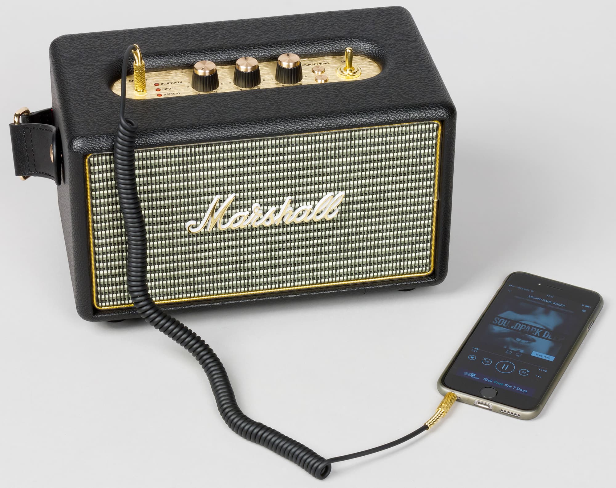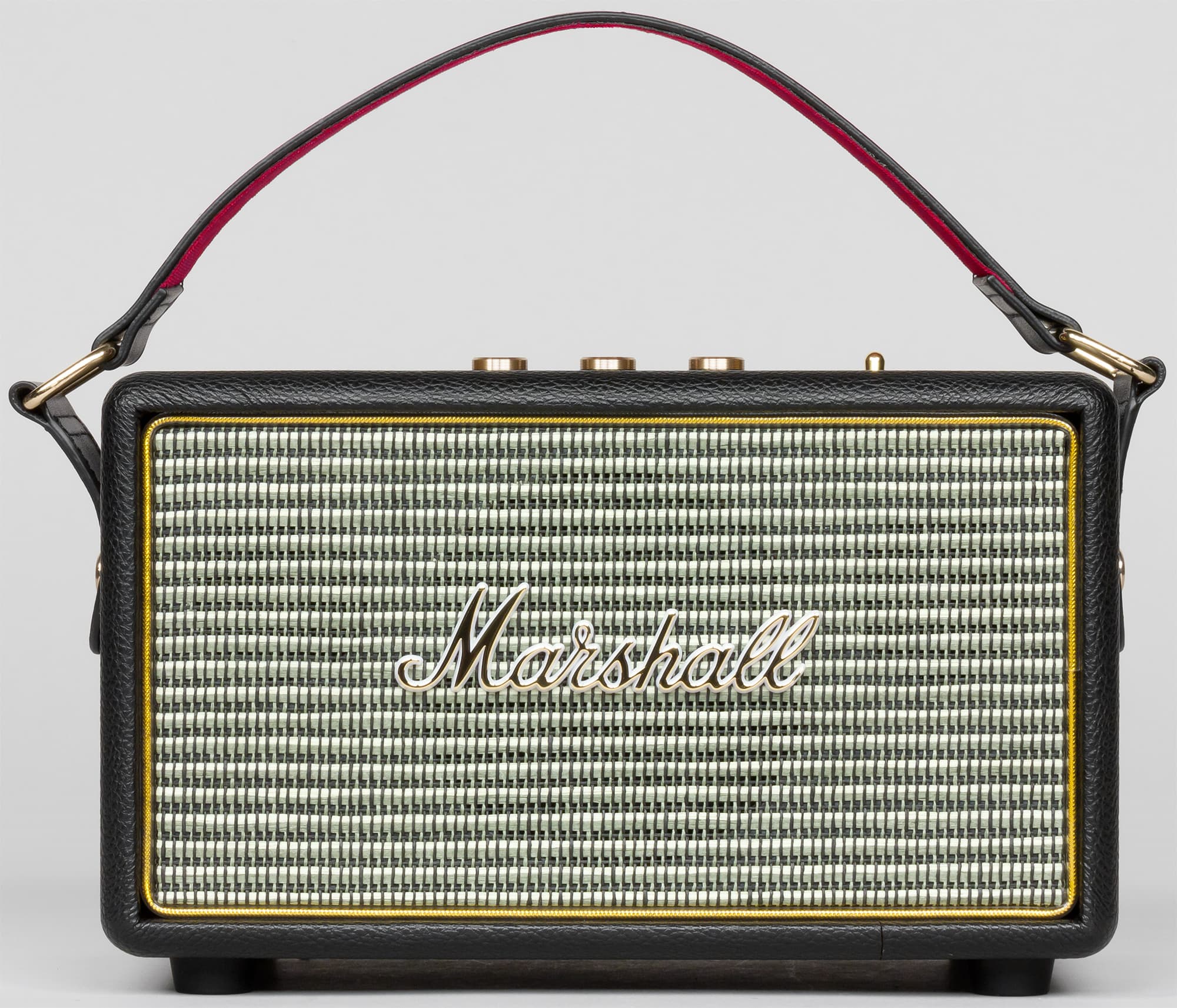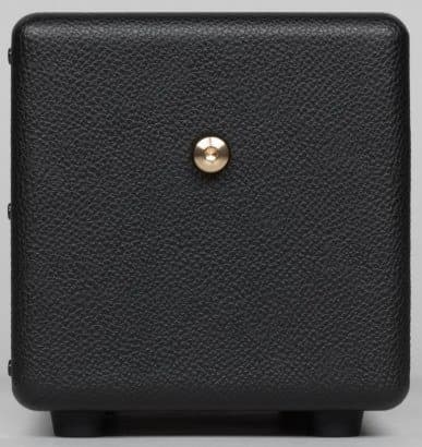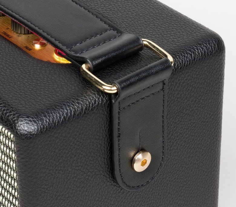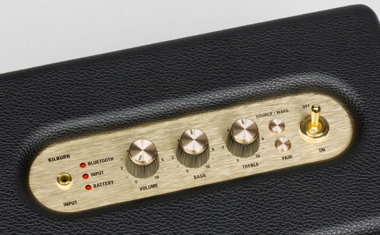 Человека, не понаслышке знакомого с Marshall Class 5 (Kilburn точь-в-точь напоминает именно эту легендарную серию), колонка в первые мгновения приводит в восторг — даже включать не обязательно. Значительную долю близких к музыке людей эта колонка способна покорить исключительно «аккуратно портированным» дизайном. Внимание к мелочам, стилистика, приятные регулировки — практически все компоненты удалось удержать на достойном уровне. Тем необычней, на фоне остальных достоинств, выглядит откровенно простенький на вид ремень из кожзаменителя, неаккуратный шов на стыке виниловой пленки и пластиковый логотип Marshall, покрытый вульгарно-блестящей позолотой. Этим недоразумениям, безусловно, не удастся испортить удачный и стильный образ устройства, но несколько неаккуратных хрипов «клипующего» сигнала в записи стеклянного звука нэкового сингл-датчика все же останется.