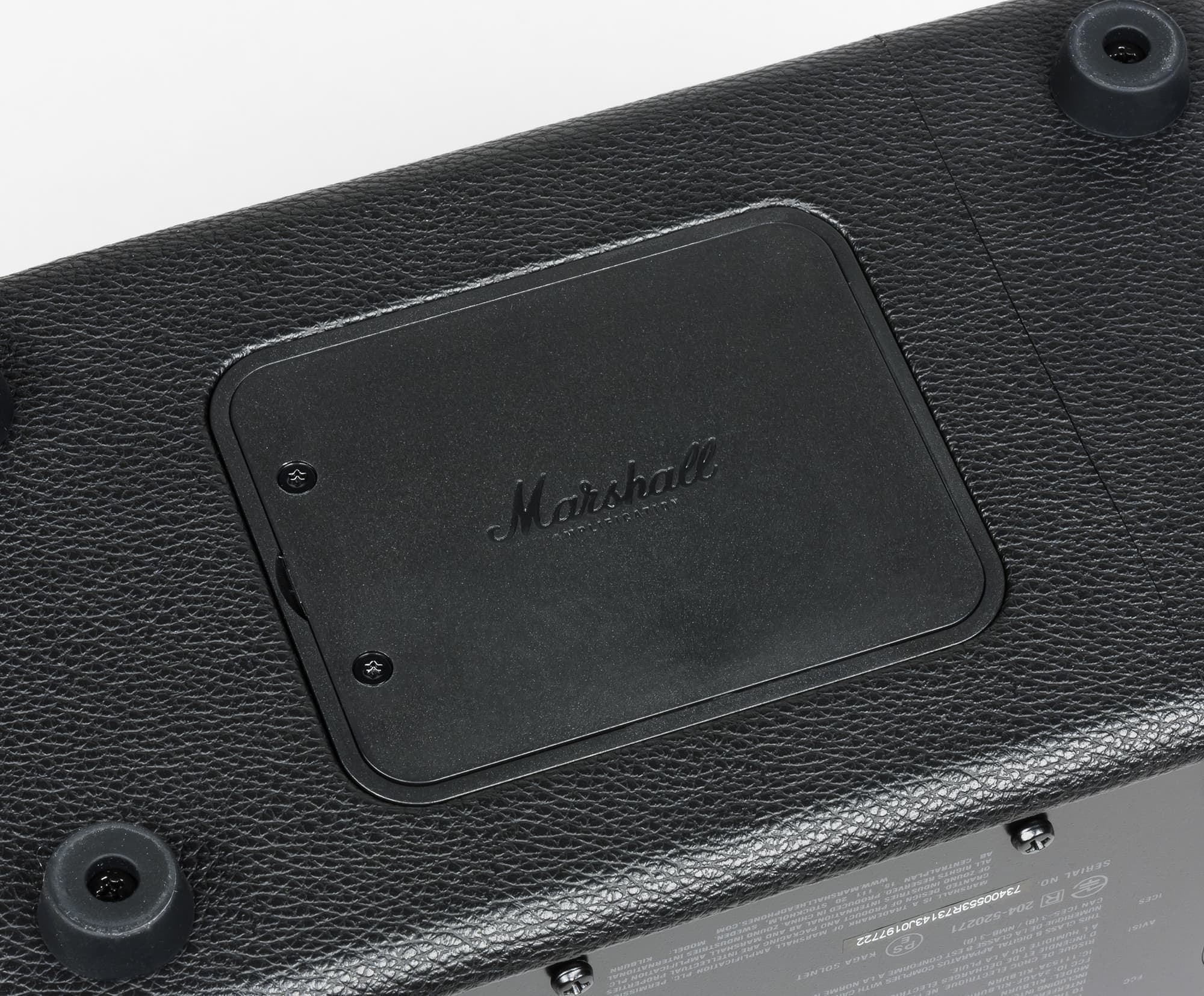 На крышку аккумуляторного отсека изнутри наклеен прямоугольный кусочек демпфирующего материала, дополнительно защищающего аккумулятор от вибрационных воздействий вследствие перемещения и эксплуатации колонки.