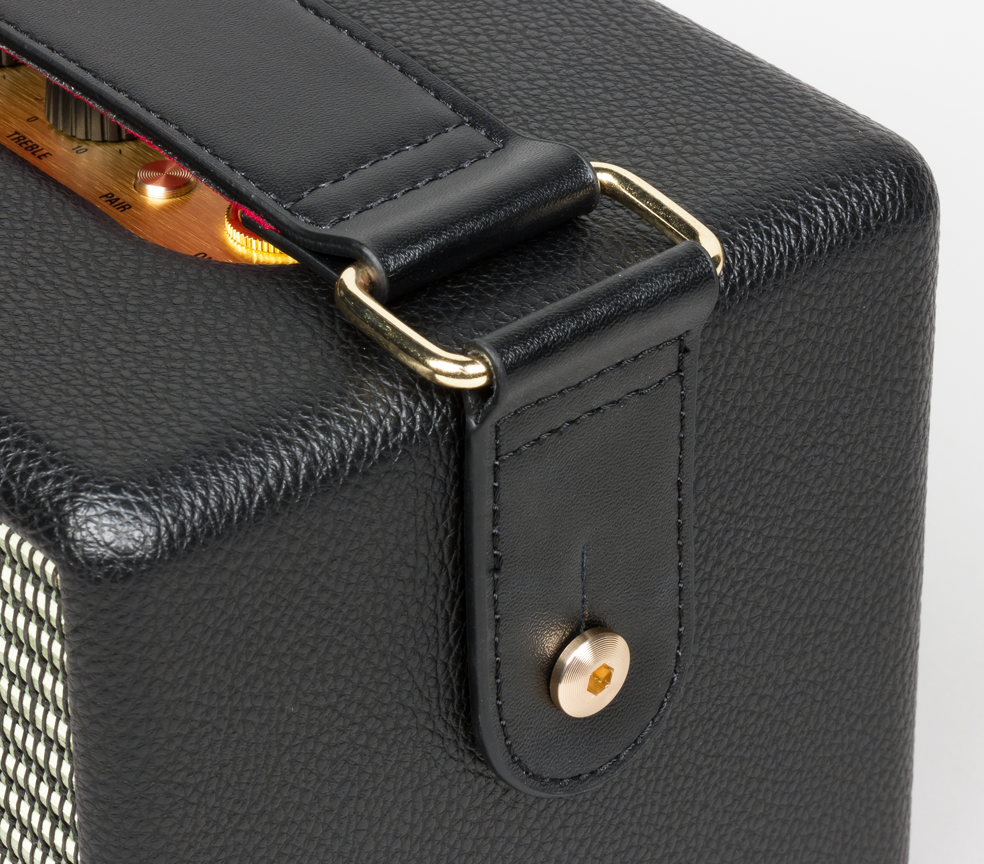 На правой и левой гранях колонки присутствуют металлические ушки, к которым крепится ремень для переноски. Похожие элементы встречаются на некоторых моделях гитарных стреплоков (приспособлений для надежной фиксации гитарного ремня).