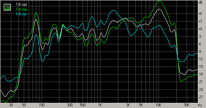 Звуковую картинку можно скорректировать доступными настройками эквалайзера. График ниже иллюстрирует разницу в АЧХ при минимальных и максимальных положениях регуляторов. Белым цветом отражена «средняя» АЧХ, описанная выше.