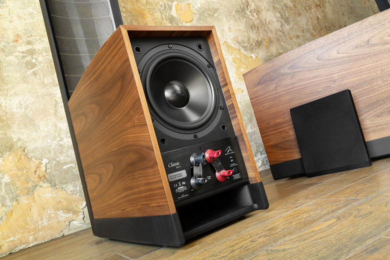 За совместную работу басовых динамиков и электростатических панелей отвечают все те же кроссоверы Vojtko, о которых мы уже говорили ранее. Частота разделения полос — 380 Гц. Нижняя часть корпуса отделана «под орех» и выглядит весьма эффектно как с надетой защитной панелью, так и без нее. Под задним динамиком расположен ряд разъемов, о которых мы поговорим далее. Еще ниже находится щелевой выход фазоинвертора, который призван увеличить глубину звучания низких частот без добавления шума порта. Передний динамик прикрыт металлической сеткой, на которой размещен небольшой логотип производителя, аккуратно вписывающийся в дизайн.