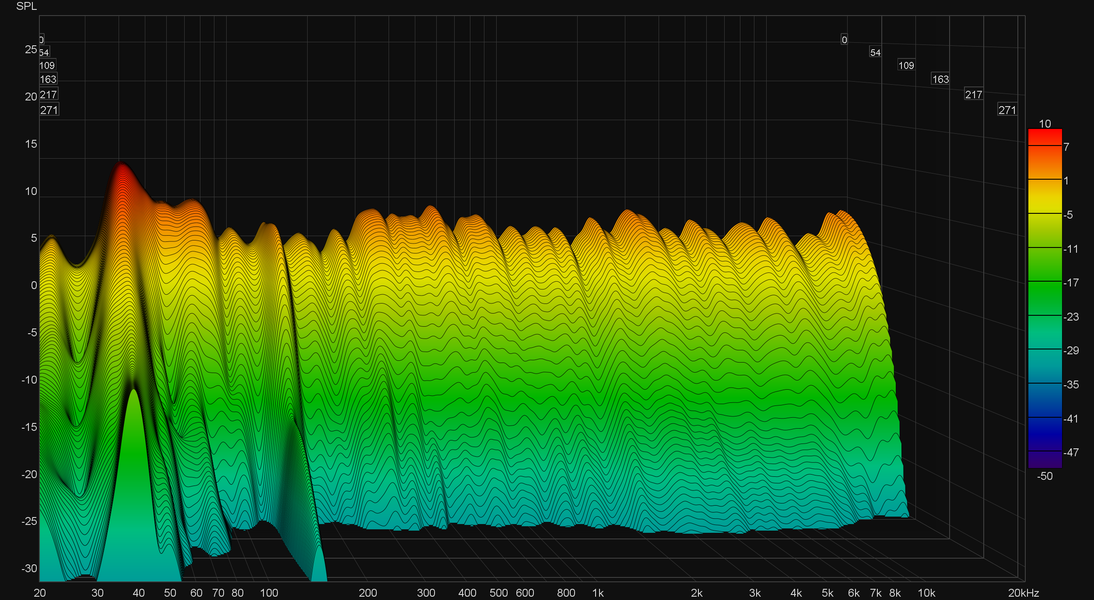 Первым обращает на себя внимание, конечно, впечатляющий объем «глубокого баса», да еще и с выраженным акцентом на нем. Нечто подобное мы видели у ElectroMotion Classic ESL 9. Интересна чуть «поддутая» нижняя середина и ровная подача среднечастотного диапазона и ВЧ-регистра — электростатические драйверы тут выше всяких похвал. Как уже упоминалось, производитель приложил максимум усилий для того, чтобы избежать лишних резонансов корпуса НЧ-секции. Но полностью избавиться от них, конечно, не удалось — такова плата за объемный бас. Это прекрасно видно по графику кумулятивного затухания спектра (он же «водопад», или waterfall).