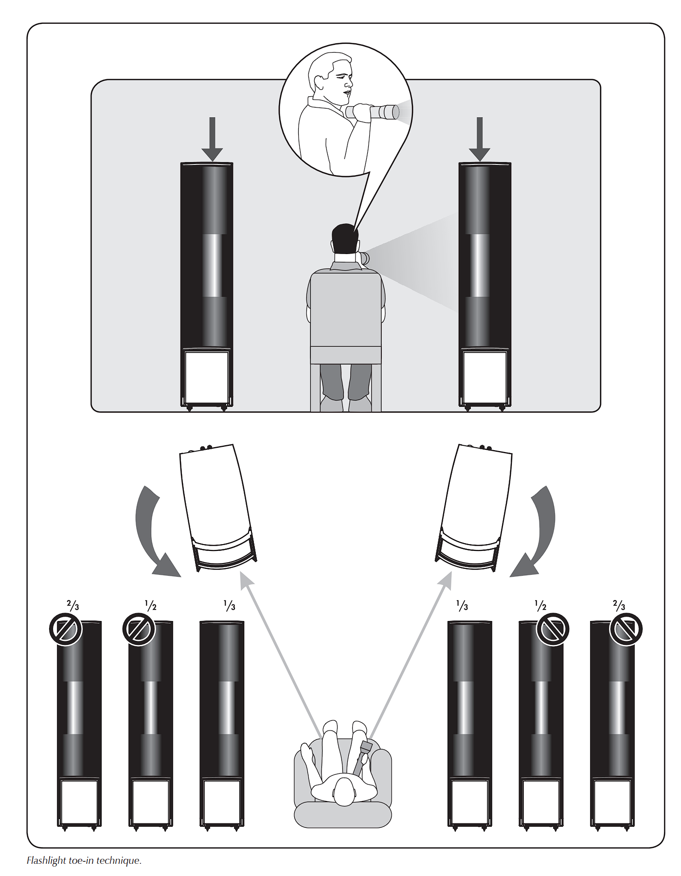 К счастью, производитель дает крайне четкие рекомендации по размещению колонок — на первом этапе можно воспользоваться ими, а далее перемещать их в поисках наиболее комфортного звучания. Отдельно отметим метод подбора угла поворота акустики с помощью фонарика, луч от которого должен освещать ближайшую к пользователю треть изогнутого драйвера.