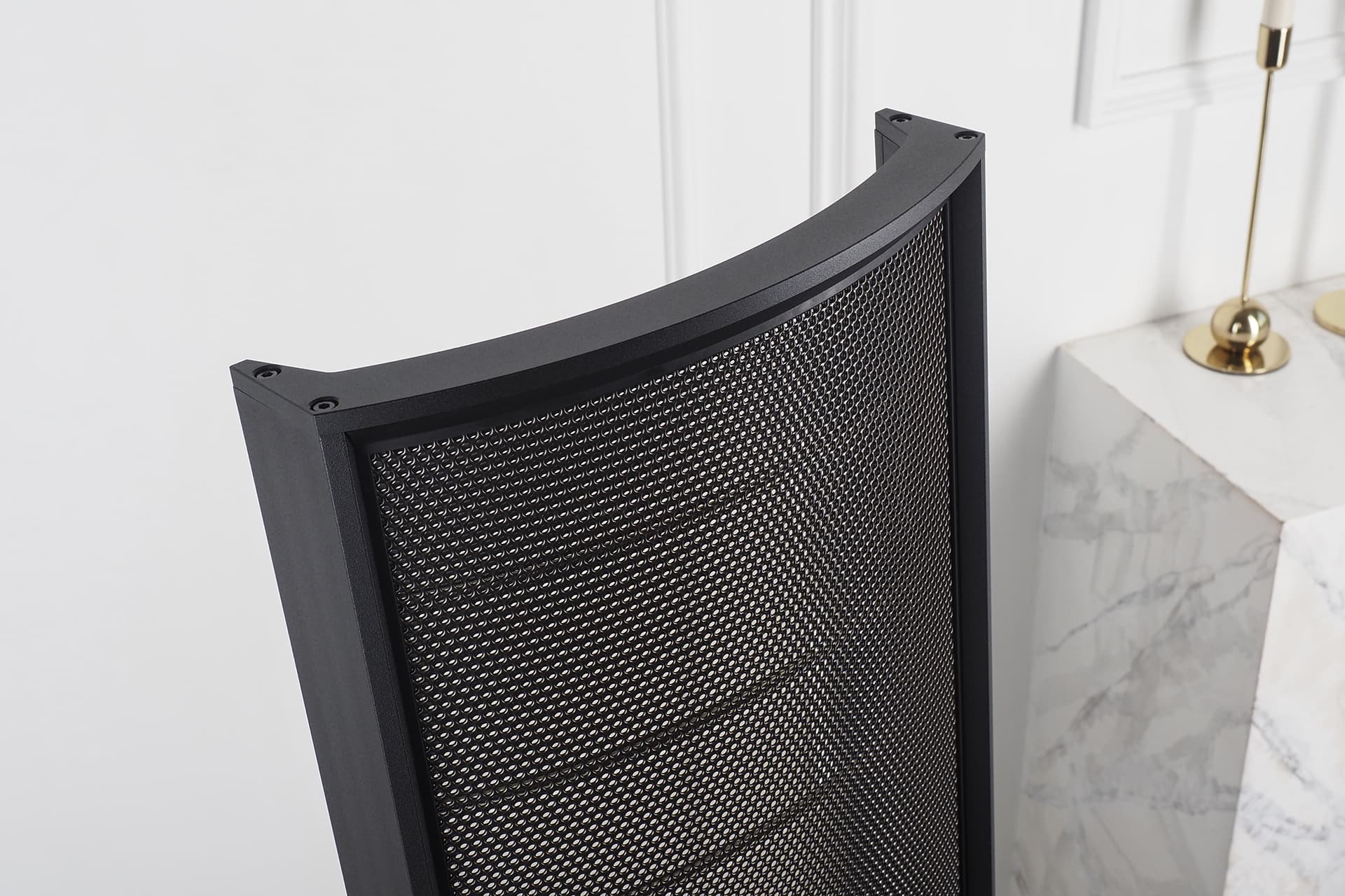 Нередко без защитных сеток колонки выглядят интереснее, чем с ними. В данном случае это не работает, сетка прекрасно сочетается с перфорированной панелью электростатического драйвера, без нее акустика выглядит как-то менее эффектно. Хотя тут дело вкуса, конечно.