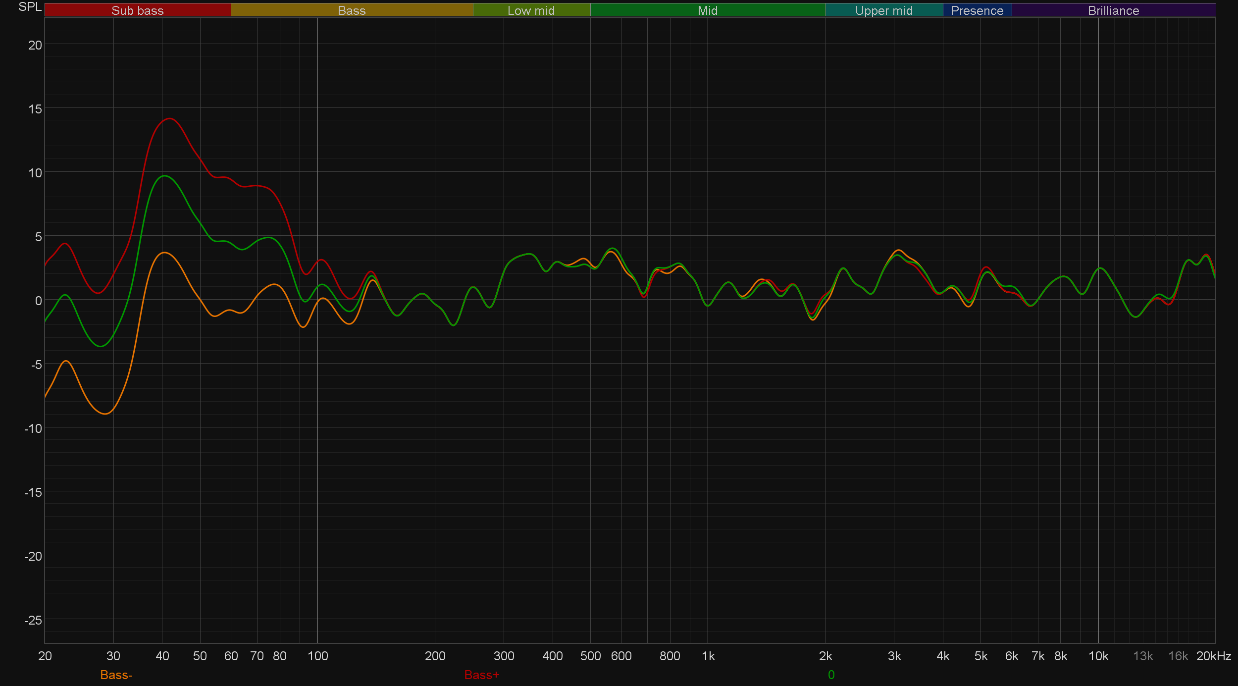 При этом протяженность пиков намного меньше, чем у уже упомянутой выше Classic ESL 9 — отказ от фазоинвертора в пользу закрытой конструкции явно приносит плоды. Самое же интересное, что в ESL 11 акцент на «глубоком басе» можно настраивать с помощью поворотного регулятора на задней панели. Посмотрим на графики в крайних его положениях.