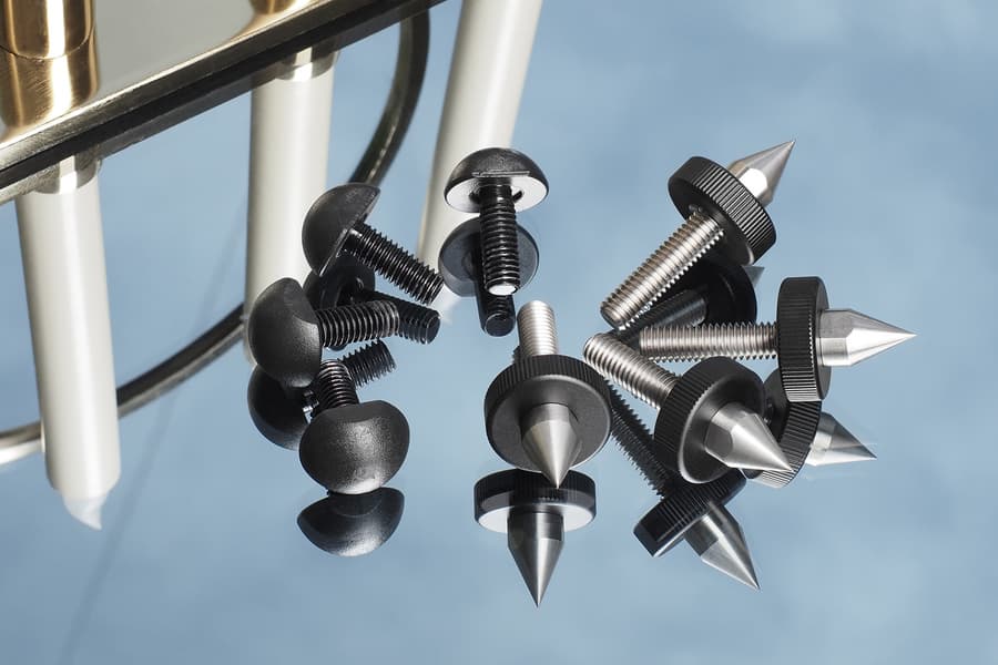 Крепление ножек резьбовое, они легко демонтируются. В комплекте есть как сферические ножки, так и шипы — в зависимости от покрытия пола и собственных предпочтений пользователь может выбрать любой из вариантов.