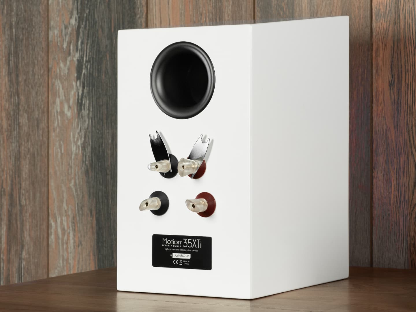 Отверстие фазоинвертора расположено сзади, ниже него размещены поддерживающие соединение с помощью разъемов «банан» клеммы для подключения и небольшой шильдик с названием модели и серийным номером.