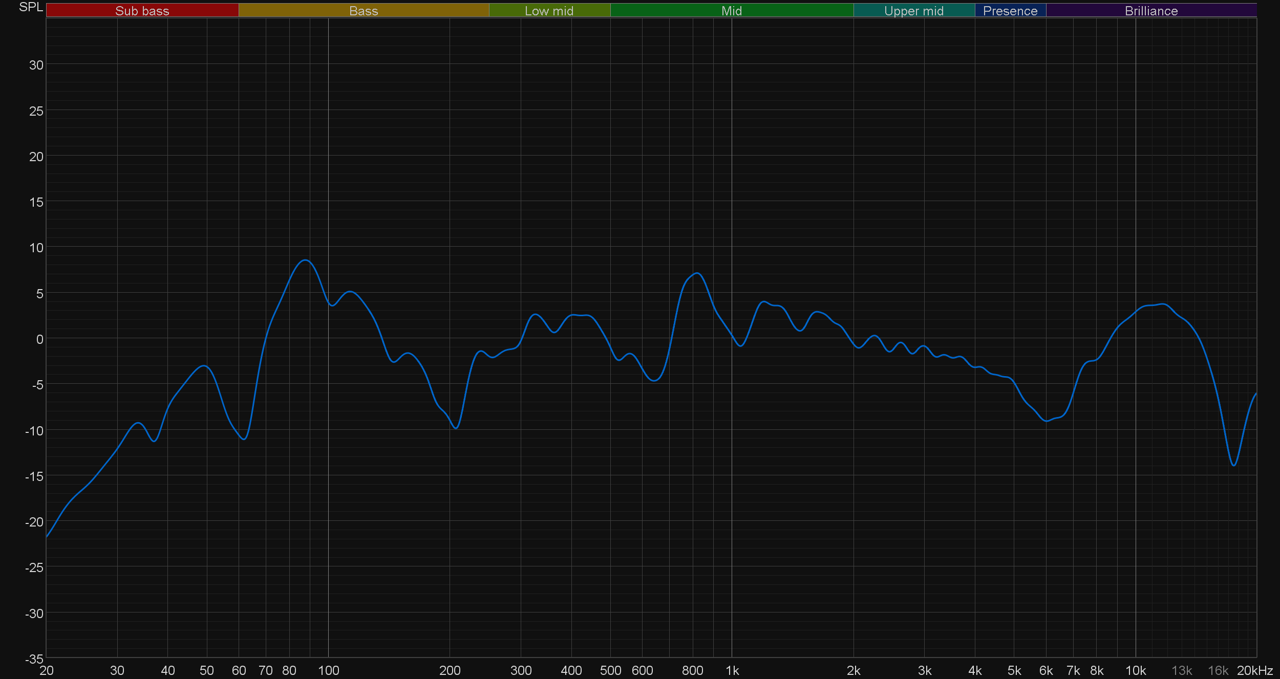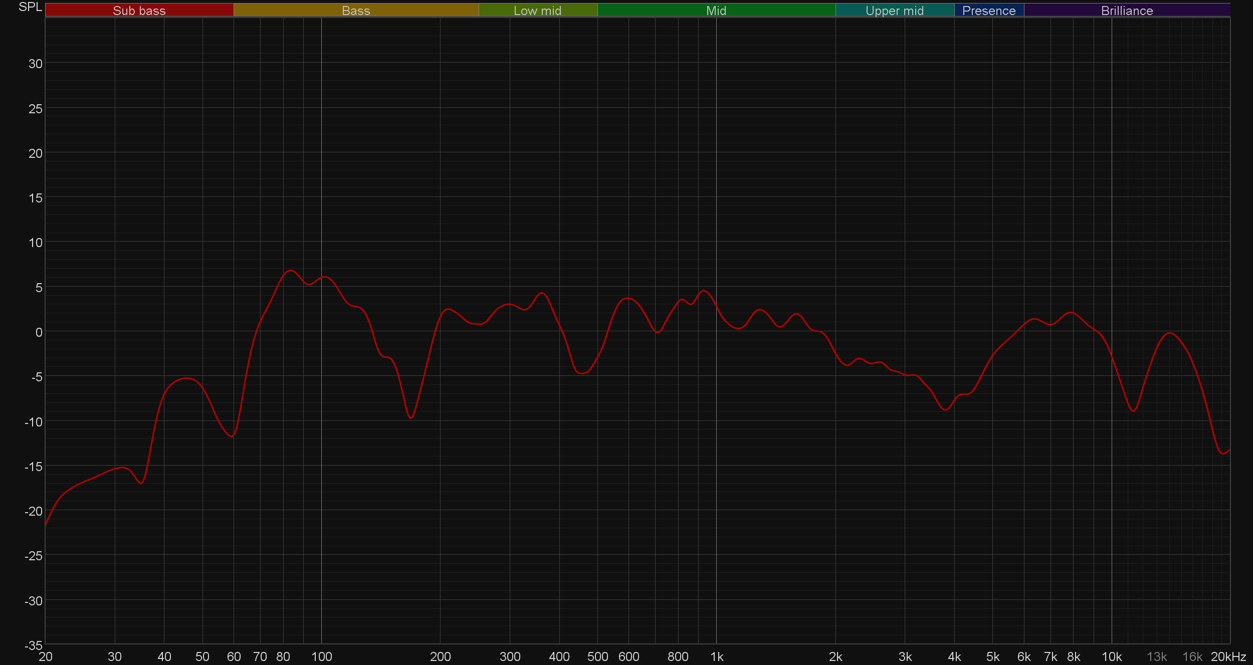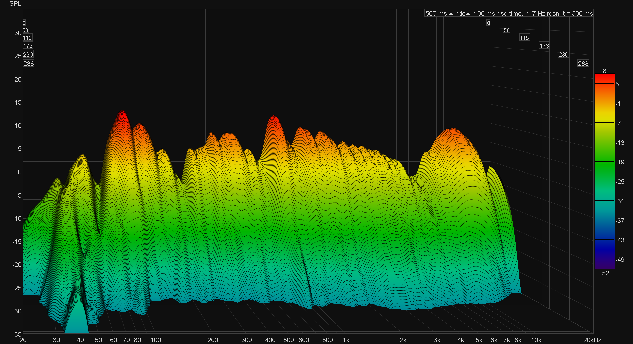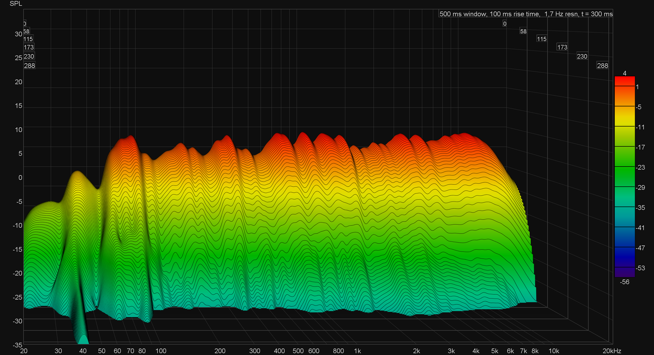 В этой точке снова взглянем на «водопад», чтобы еще раз обсудить ключевые особенности звучания колонок. Долгое затухание в районе 40 Гц и получившийся пик от 60 до 100 Гц дали нам то самое ощущение гулкости. Но ничего сверхкритичного здесь нет, все очень пристойно и удовольствия от прослушивания не портит.