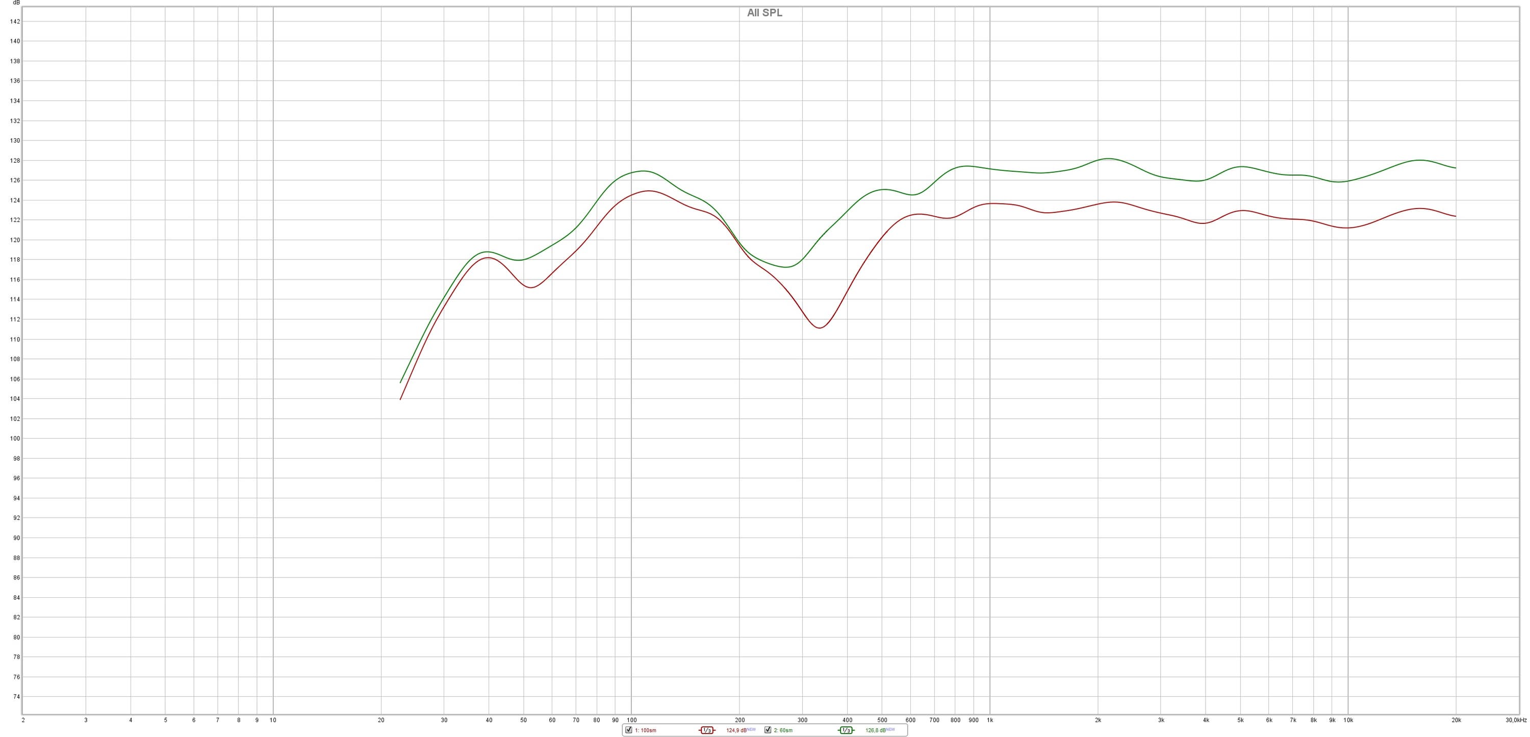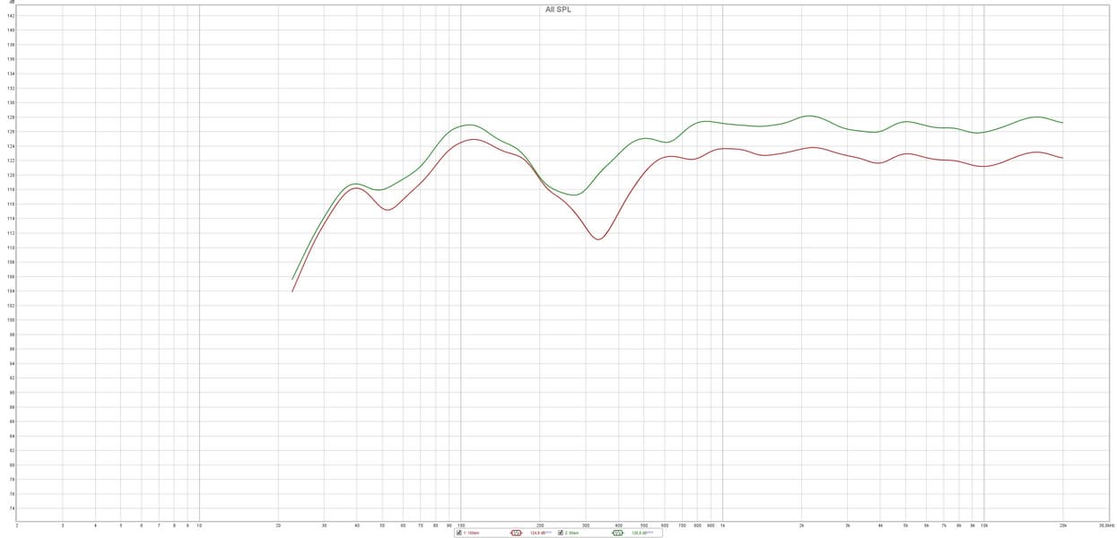 Ниже представлены два графика АЧХ тестируемого экземпляра Martin Logan Motion 40i для расстояния микрофона 60 см (зеленый график) и 1 м (красный график).