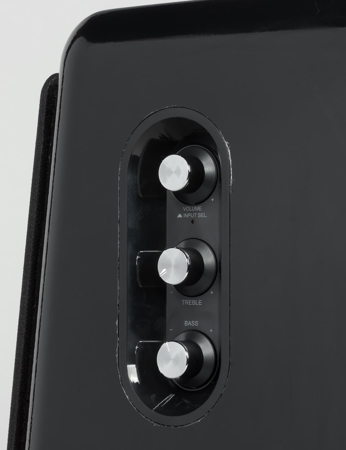 На правой стороне активной колонки находится блок управления с регуляторами громкости и частот. Все три регулятора — валкодеры с дискретным ходом без ограничений по углу вращения. По нажатию на регулятор громкости происходит переключение между источниками звука. В момент переключения срабатывает светодиодный индикатор, расположенный на той же панели.