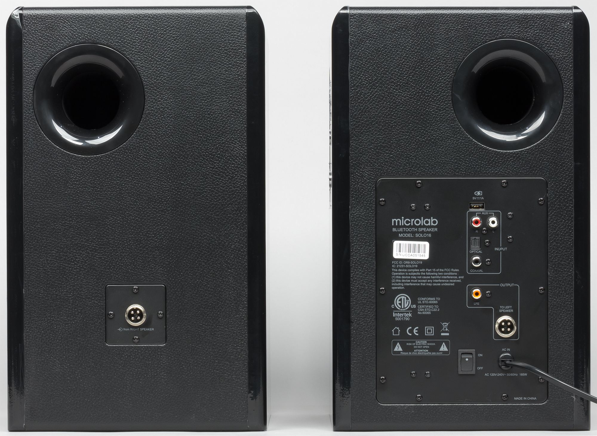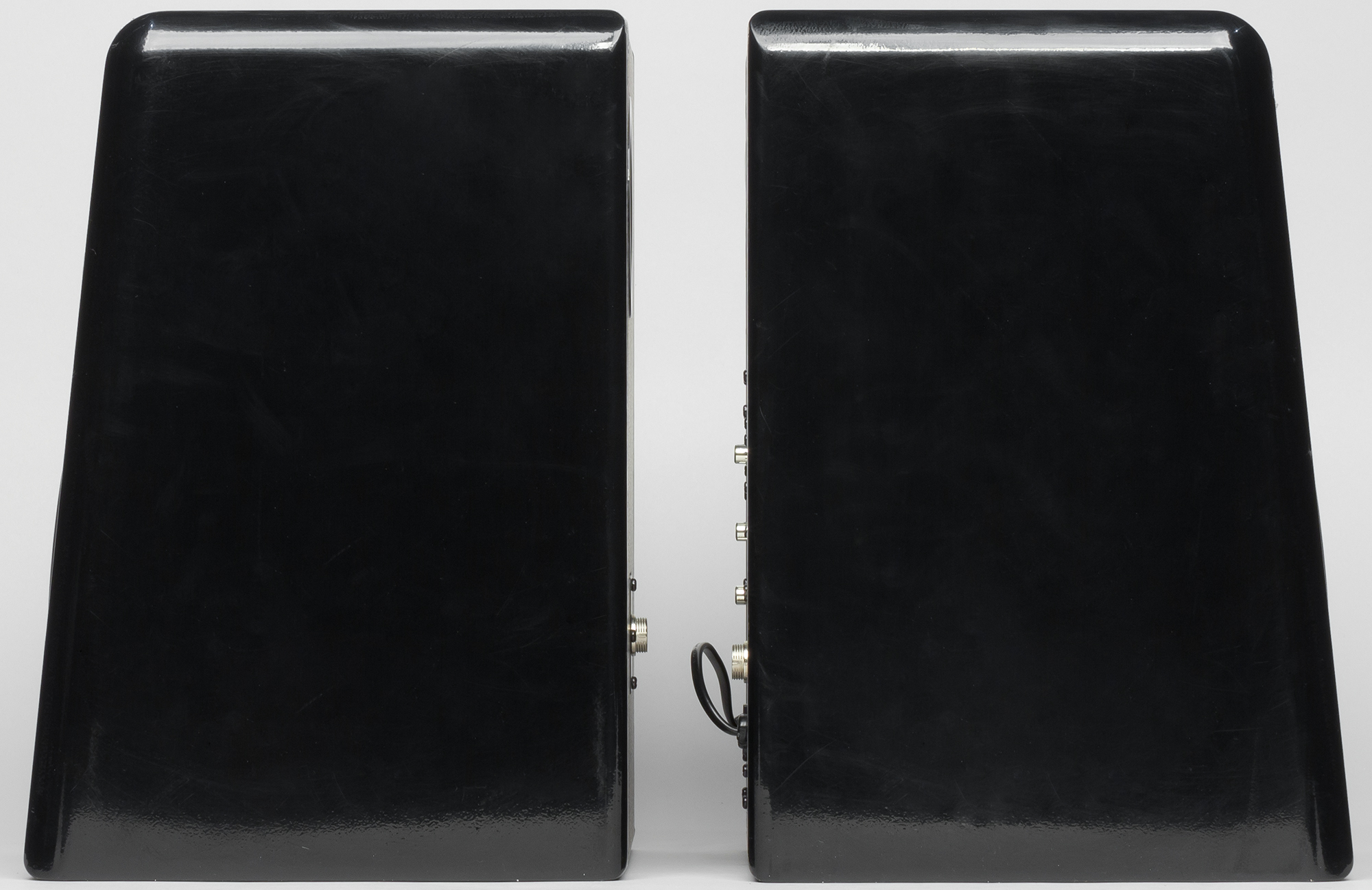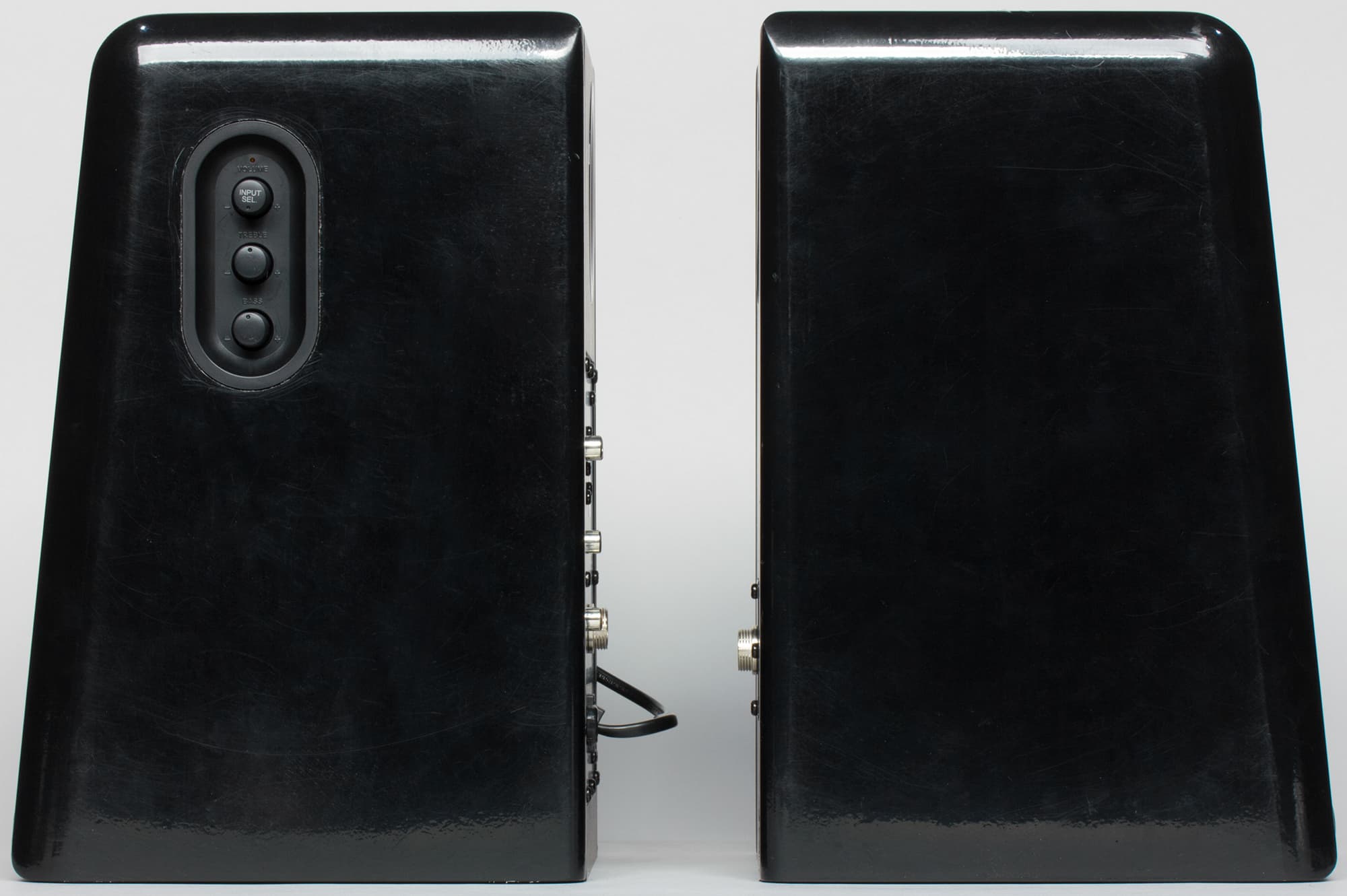 Отверстия фазоинверторов расположены на задней стенке. На пассивной колонке на ней также находится разъем для подключения к усилителю, на активной — разъемы для подключения источников звука, выход для подключения пассивной колонки, клавиша питания, несъемный сетевой кабель.