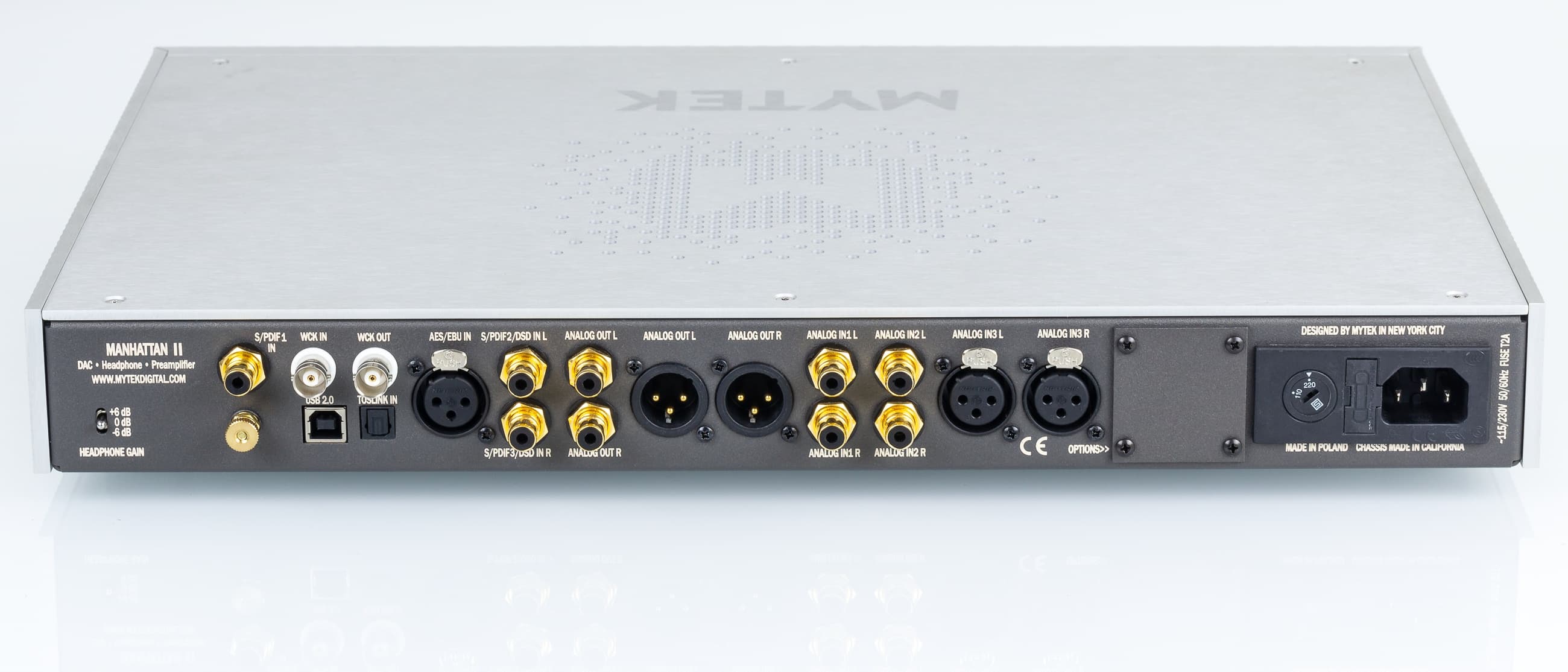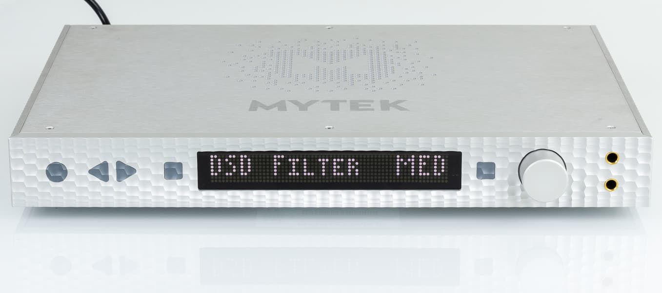 Manhattan DAC II (страница на сайте производителя) является самым дорогим и технически совершенным USB-ЦАПом производителя. Его выход был фактически приурочен к появлению нового флагманского чипа ЦАП — ES9038 Pro. В Mytek традиционно придерживаются такого подхода, это уже не первое и не второе поколение продуктов подобного рода на флагманских чипах ESS Technologies. Для полной реализации потенциала преобразователей производитель использует уникальный линейный блок питания и тактовый генератор Mytek Femto Clock, также собственной разработки. На передней панели находятся два выхода на наушники, куда можно подключить 2 пары обычных наушников или требовательные Hi-End-модели по балансному подключению, через переходник на 4-контактный XLR. Заявленная мощность усилителя — 6 Вт, импеданс 0 Ом.