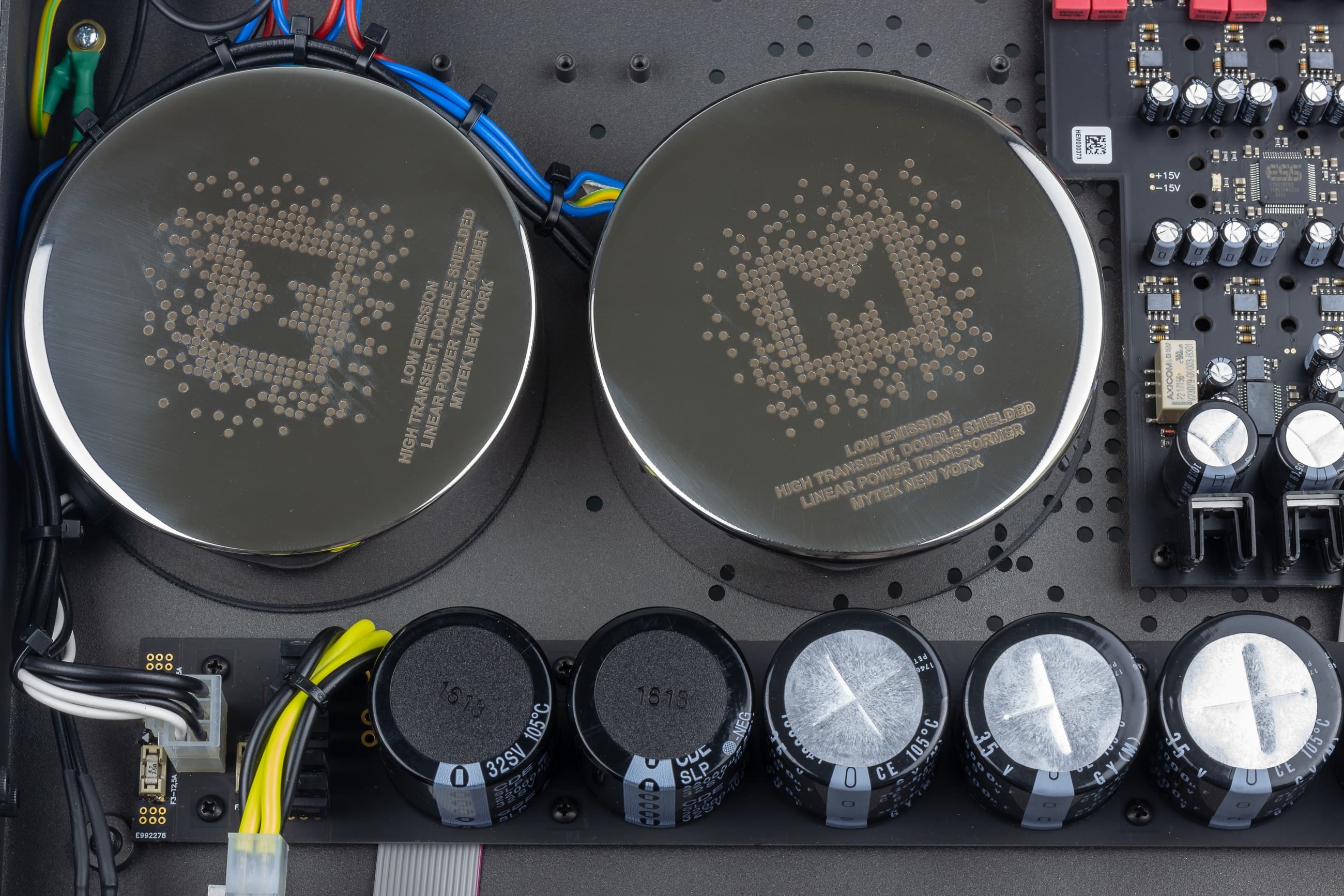 Линейный БП выполнен на тороидальных трансформаторах, заключенных в двойной металлический экран. Это необходимо, чтобы избежать электромагнитных наводок на внутренние электрические цепи. Для сглаживания пульсаций стоит целая линейка из емкостей. Так как в устройстве требуется несколько шин питания разного напряжения, применено такое большое количество конденсаторов. Схема питания вынесена на отдельную печатную плату. В общем-то, большой размер корпуса и вес 8 кг как раз объясняются встроенным линейным БП.