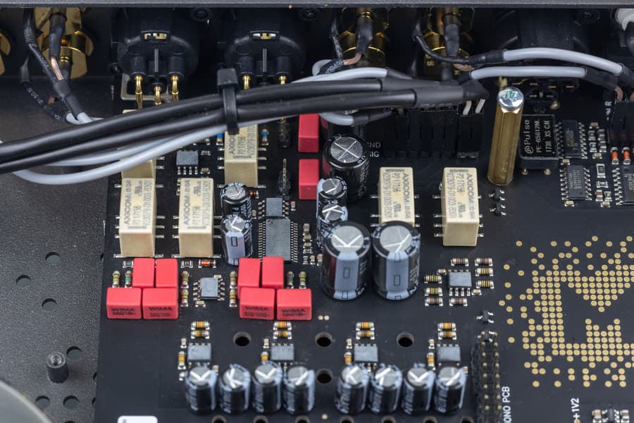 Внутренняя начинка брендовой техники всегда интересна. Большие габариты корпуса позволили с комфортом разместить все модули и удалить их друг от друга во избежание наводок, а также запитать отдельным питанием. Разъемы подключения соединены с основной платой качественными проводами большого сечения.