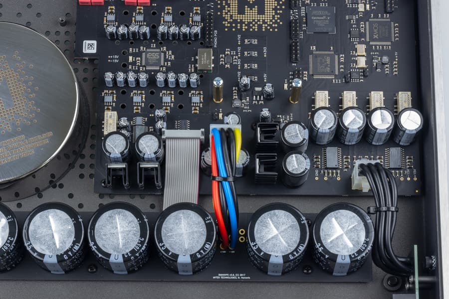 Цифровая часть устройства очень интересная. Здесь производитель собрал все возможные виды процессоров, которые можно увидеть в таких устройствах: XMOS XU216, SТM32, FPGA Altera Cyclon V и микроконтроллер NXP. Производитель не раскрывает подробностей о работе цифровой части. На наш взгляд, XMOS используется для USB и обмена с контрольной панелью карты в Windows и macOS X, STM32 — для управления с ИК-пульта ДУ и вывода информации на экранчик, Altera занимается формированием цифровых сигналов, а NXP может обслуживать опциональное Ethernet-подключение и стриминговые функции.