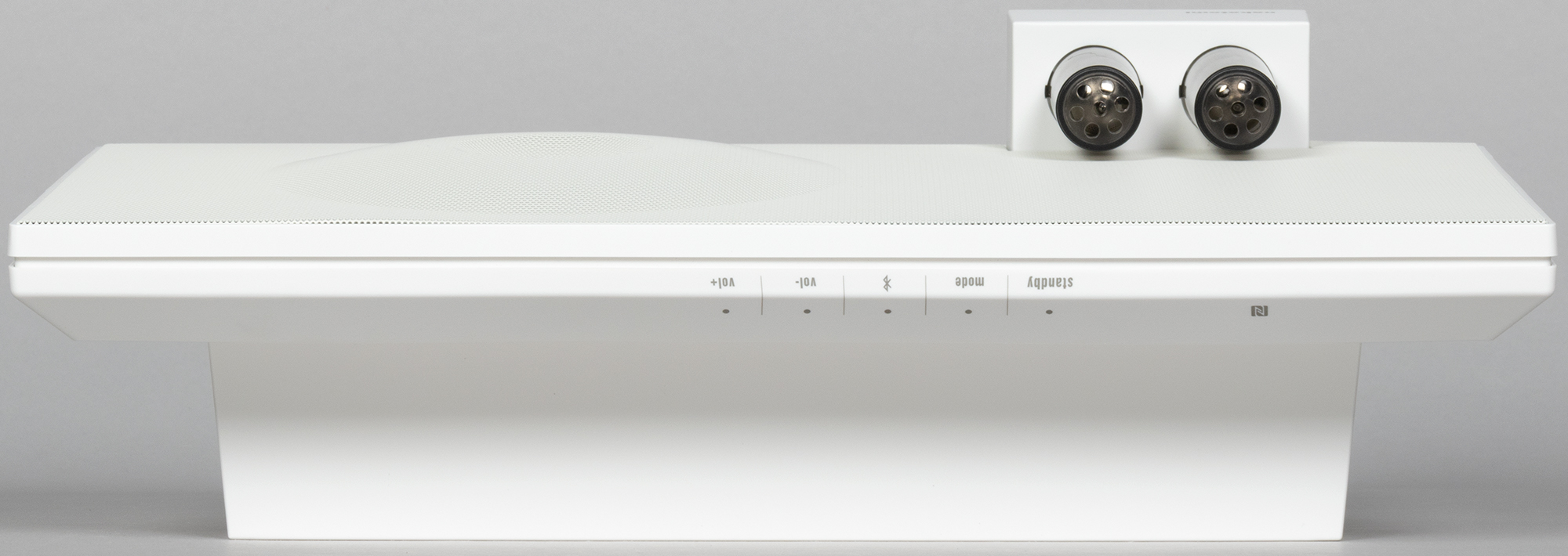 «Все компоненты акустической системы подобраны и согласованы так, чтобы порадовать в первую очередь поклонников «теплого лампового звука» — звучания без раздражающих слух гармоник и высокочастотных шумов. Так, питание акустической системы возложено на вынесенный отдельно для уменьшения наводок мощный трехамперный адаптер, цепи питания построены на надежных полевых MOSFET-транзисторах. Входящий сигнал, обработанный микроконтроллером ЦАПа и цифровым аудиопроцессором, попадает на каскад современных вакуумных ламп, дающих ту самую теплую и обволакивающую уютом окраску звуку в очень широком диапазоне частот. Окончательный выходной сигнал формируется современным усилителем D-класса, высокий КПД которого позволяет не растрачивать подводимую мощность на нагрев воздуха, а реализовывает ее через два среднечастотных и один низкочастотный динамик с низкоинерционными куполами из бумажной массы. Приводы СЧ-головок вооружены быстрыми двухслойными неодимовыми магнитами, НЧ — мощным многослойным ферритовым».