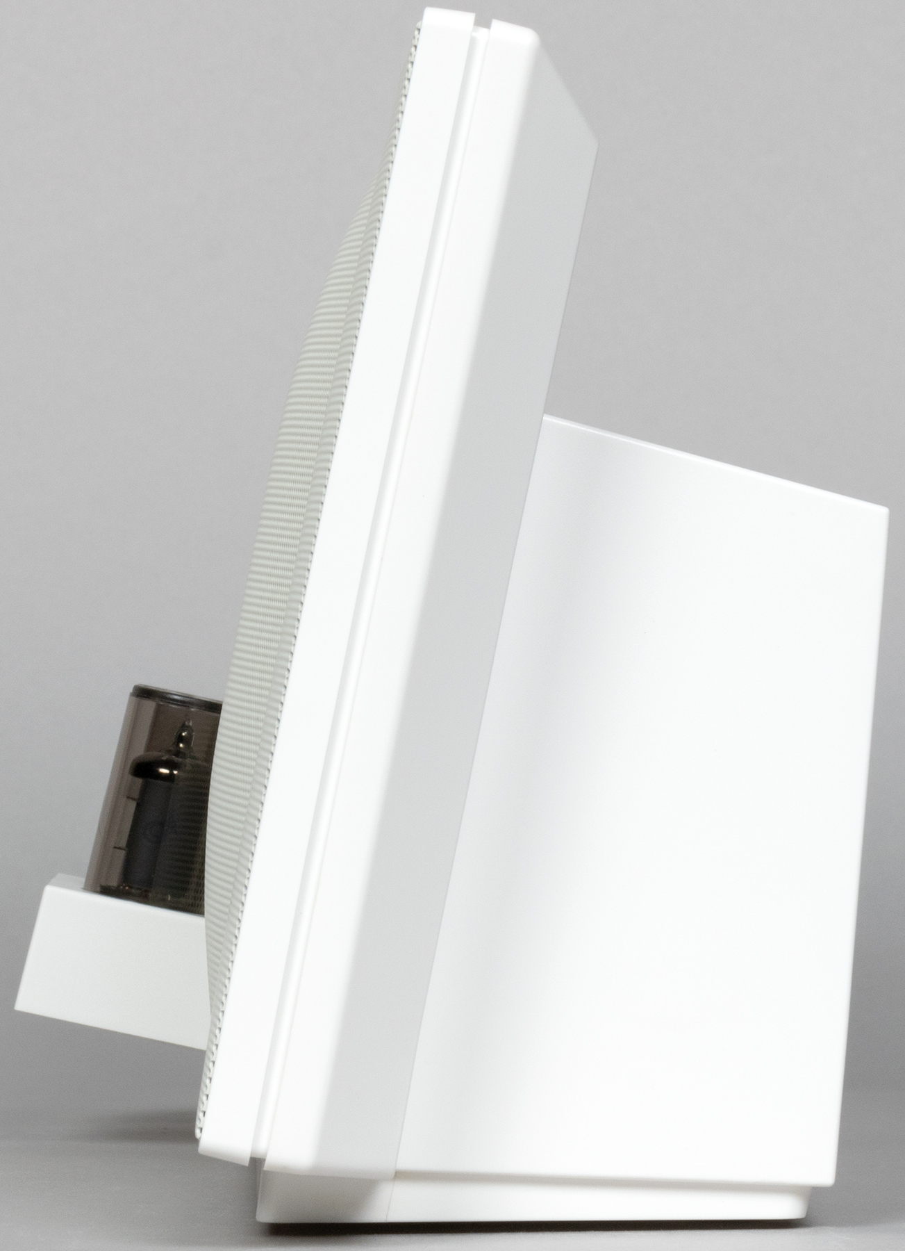При взгляде сбоку хорошо заметно, что колонка чуть наклонена назад. Очень правильное решение, помогающее направить звук в сторону слушателя при размещении устройства ниже его головы — а именно так, скорее всего, оно и будет размещаться. В целом же ничего особо интересного на боковых панелях нет.