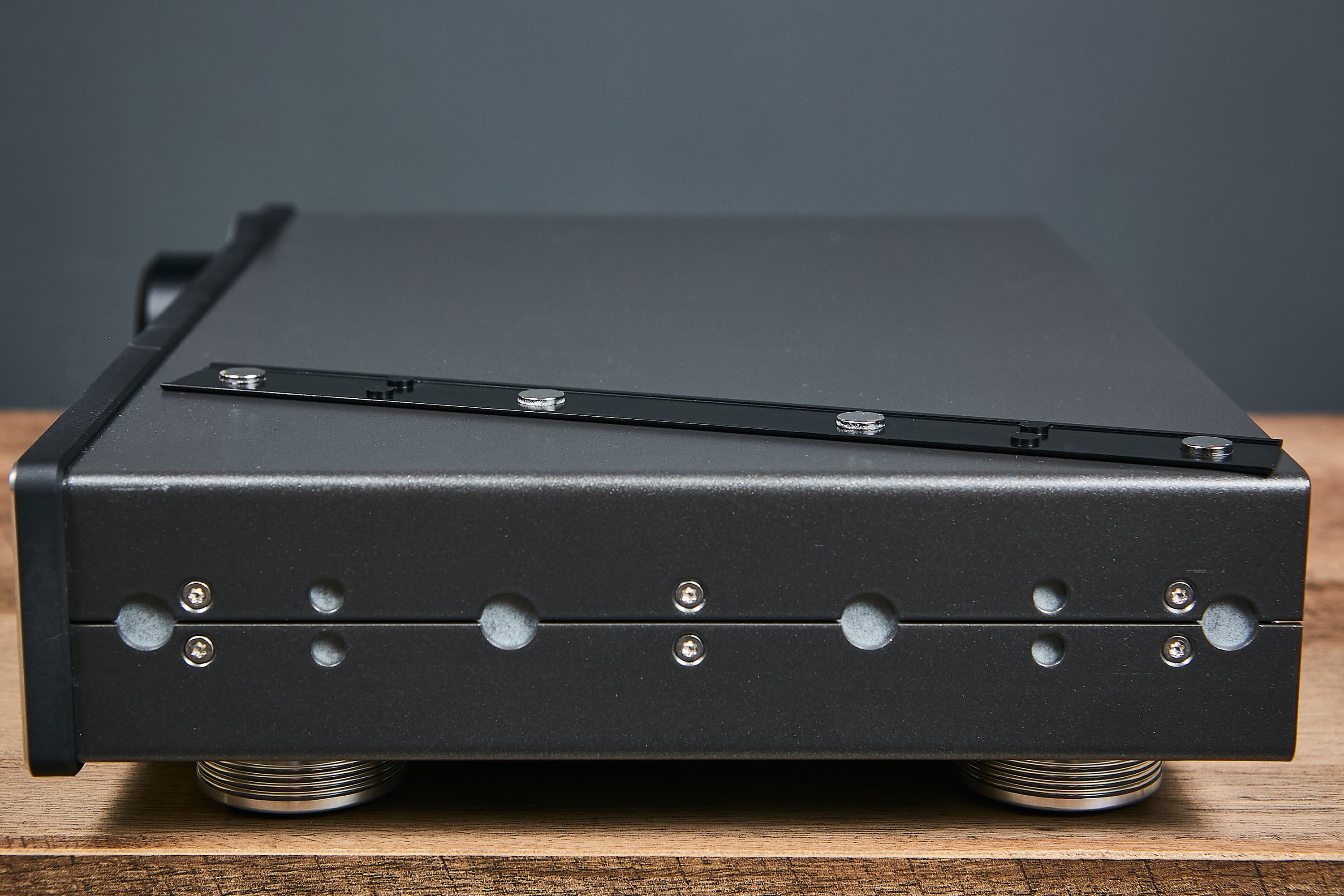 Выглядит устройство крайне солидно, корпус выполнен из окрашенного в черный цвет металла, передняя панель, как уже упоминалось — из 10-миллиметрового анодированного алюминия.