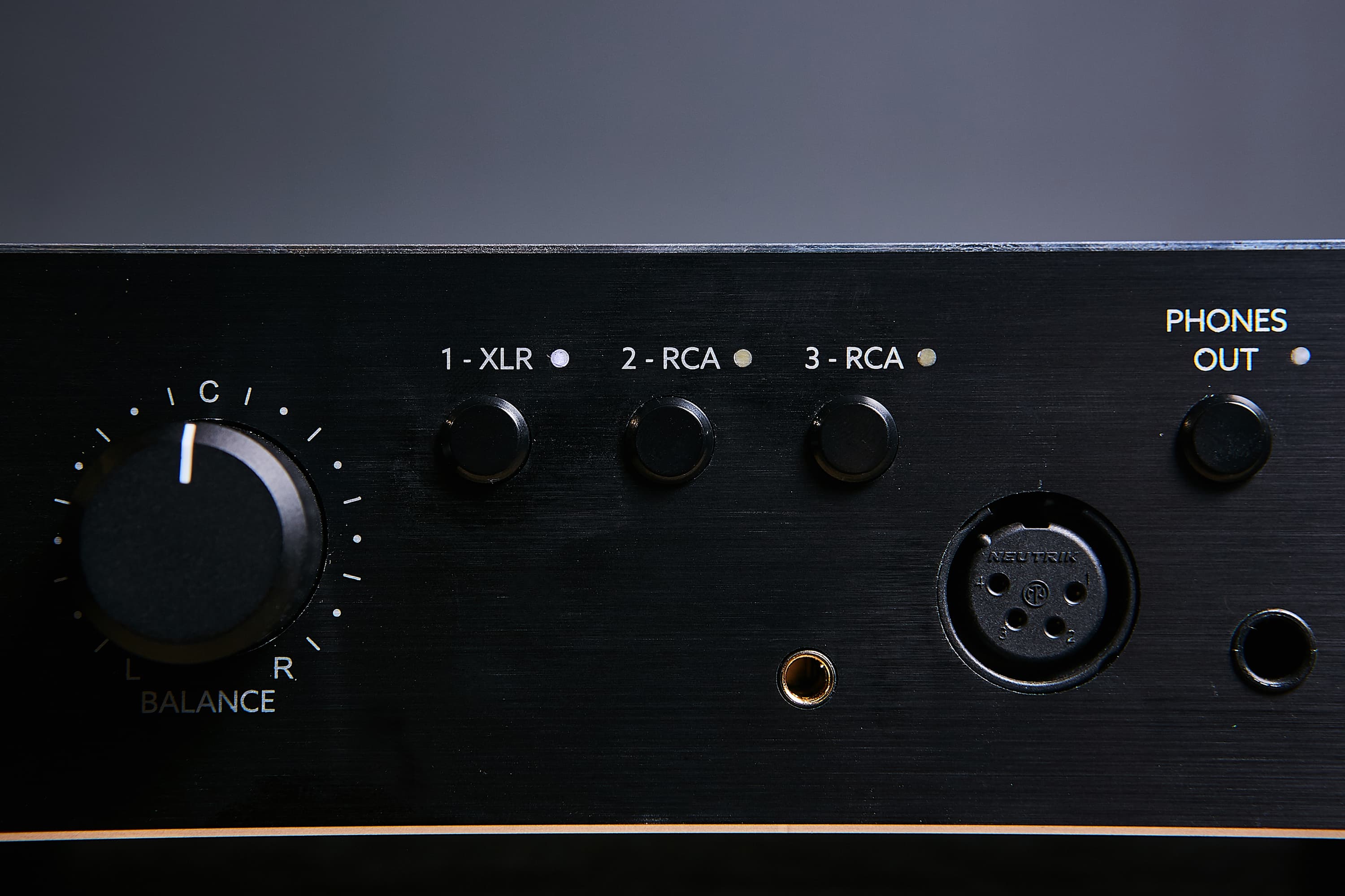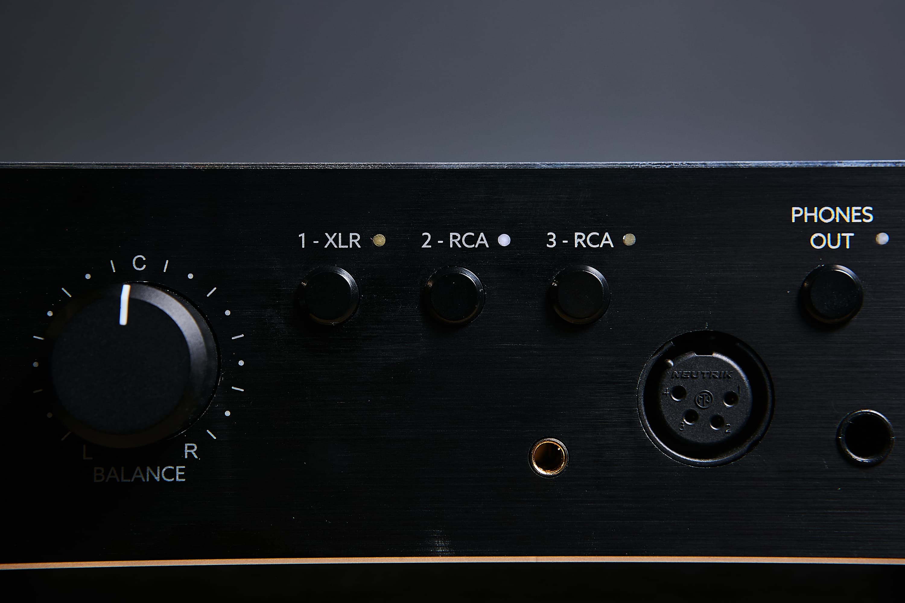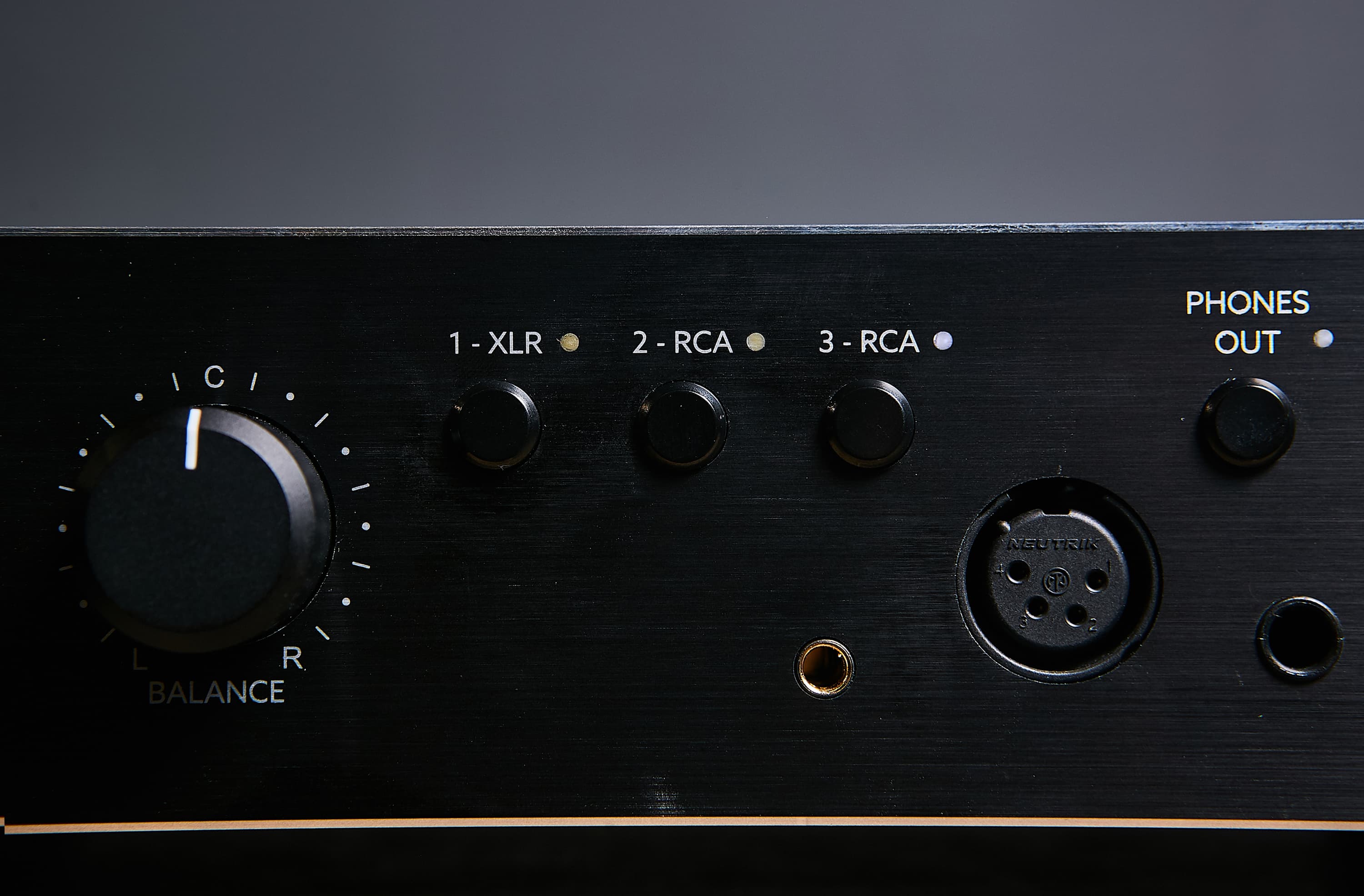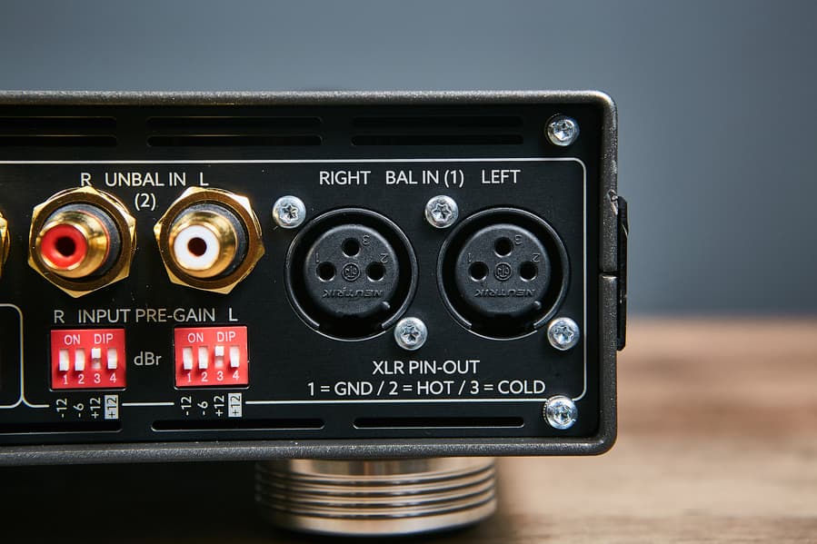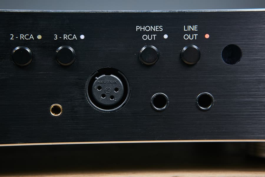 Входов три — два небалансных RCA плюс балансный XLR female. Разъемы, кстати, отлично себя зарекомендовавшие — бренда Neutrik.