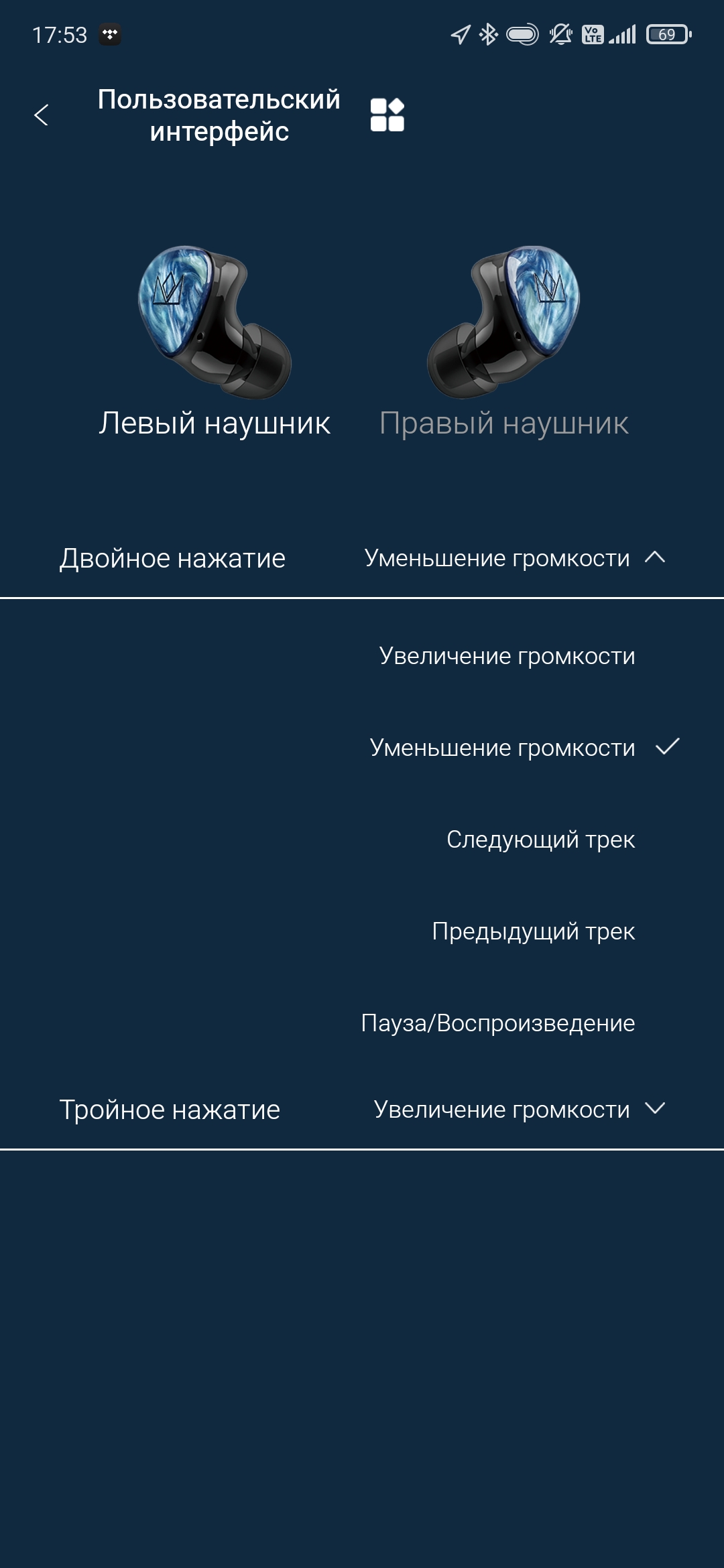Ну и, наконец, настройка двойных и тройных тапов по сенсорной панели. На них можно «повесить» функцию изменения громкости, перелистывание треков или управление воспроизведением. В следующем меню можно выбрать язык приложения, настроить громкость, а также активировать функцию «Переключение стилей», описания которой нам найти не удалось. Выяснить, что же делает этот переключатель, путем включения и отключения тоже не получилось — звук не меняется, внешний вид тоже… Возможно, в будущих обновления ПО эта опция получит некое развитие и ее предназначение станет более понятным.