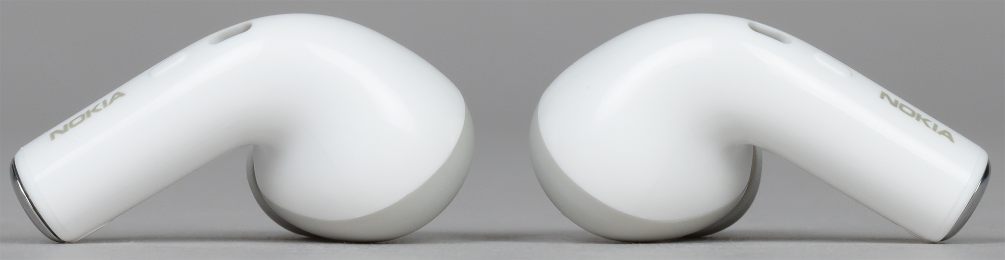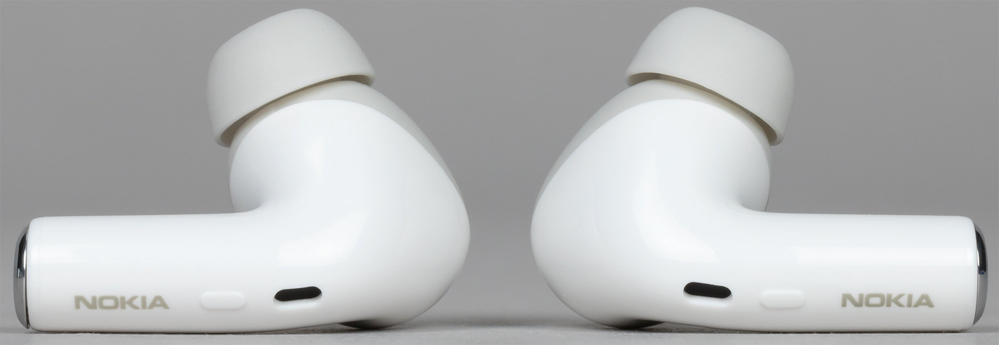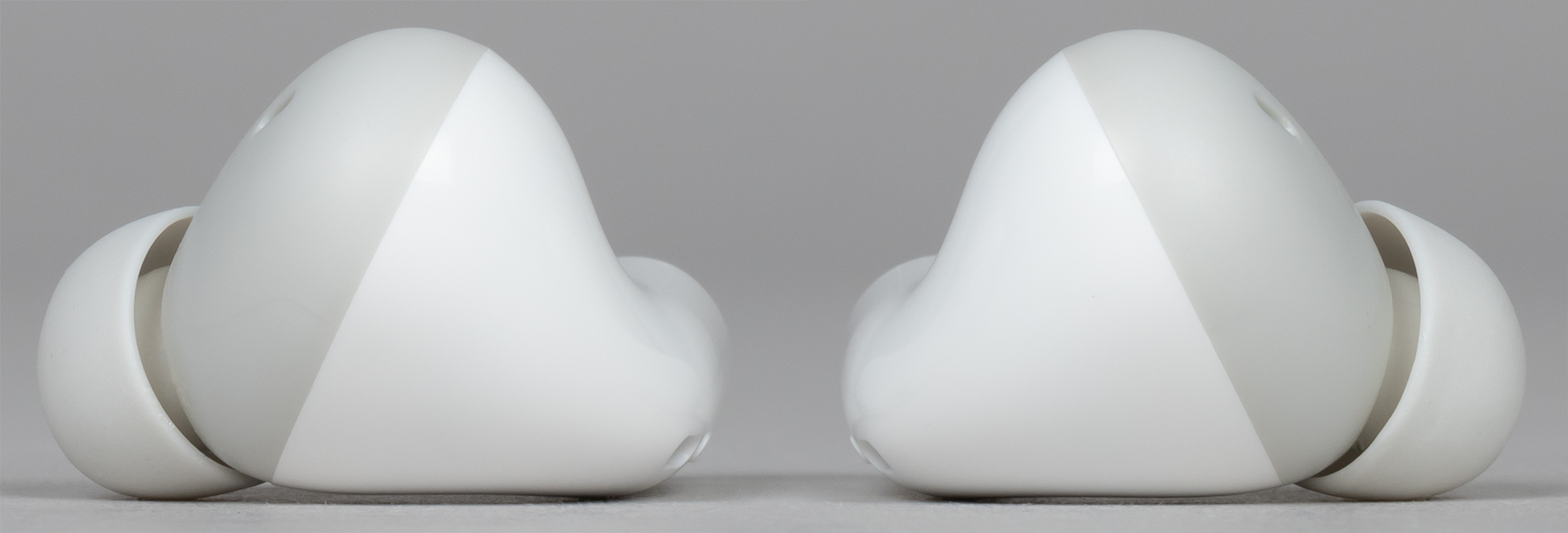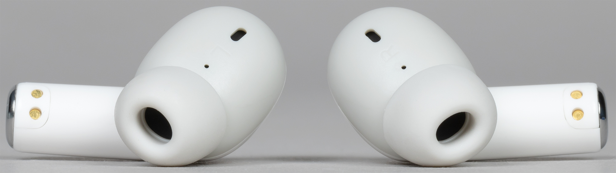 На внешнюю сторону корпуса нанесен логотип, выше него находится небольшой выступ — маркер сенсорной зоны, еще выше — отверстие второго микрофона, используемого для работы функции «звуковой прозрачности».