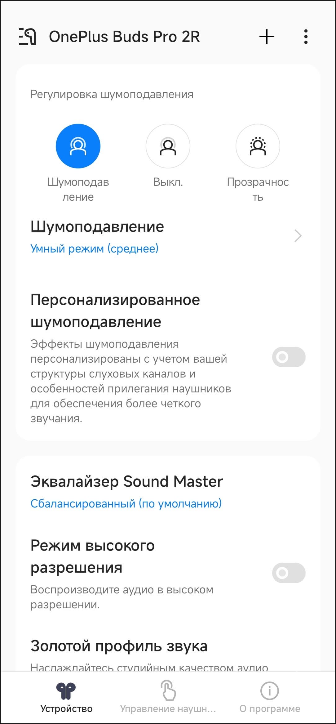 Также можно выполнить проверку слуха и настроить персонализированный профиль шумоподавления. Честно говоря, за всё время тестирования нам не удалось понять, как именно эта функция работает и какие преимущества дает — трех режимов и «умного» переключения между ними оказалось более чем достаточно.