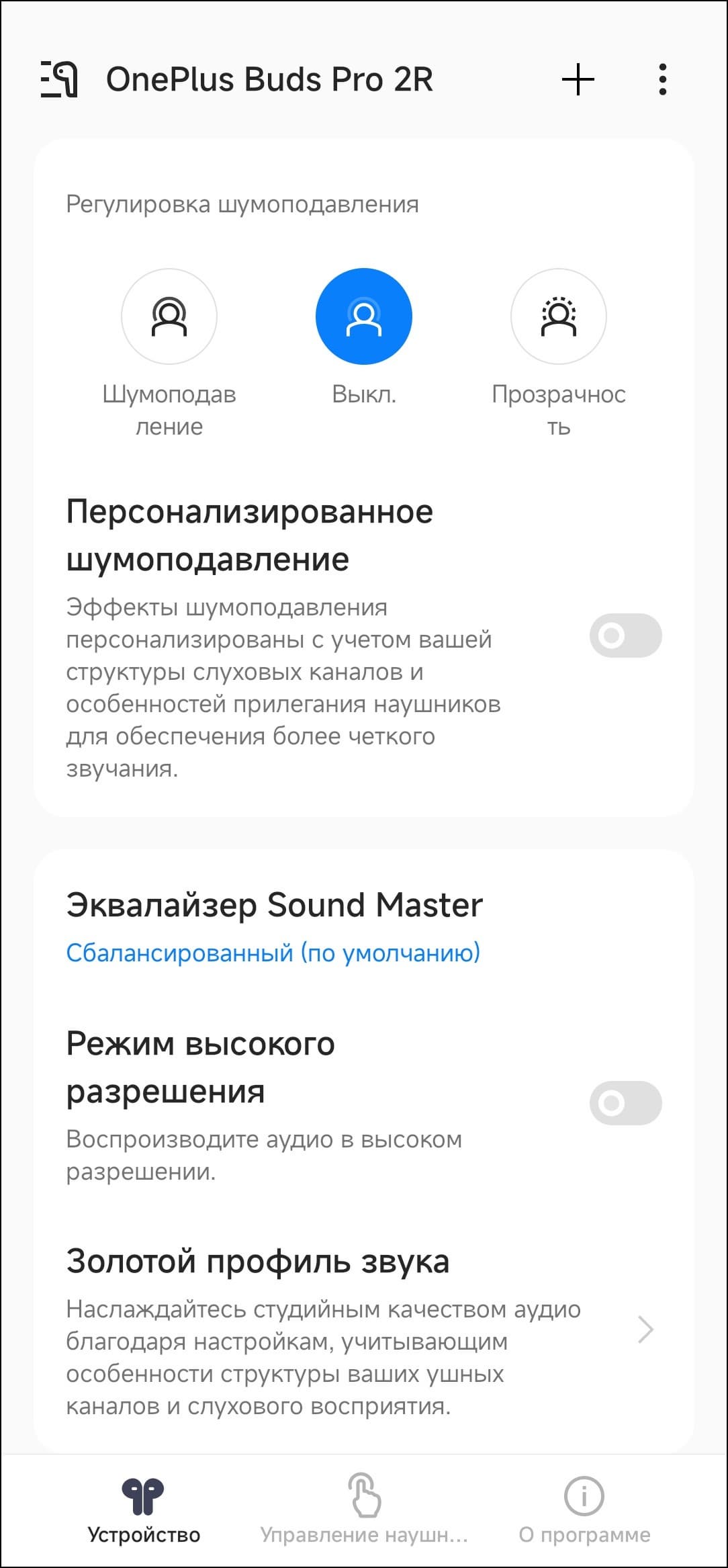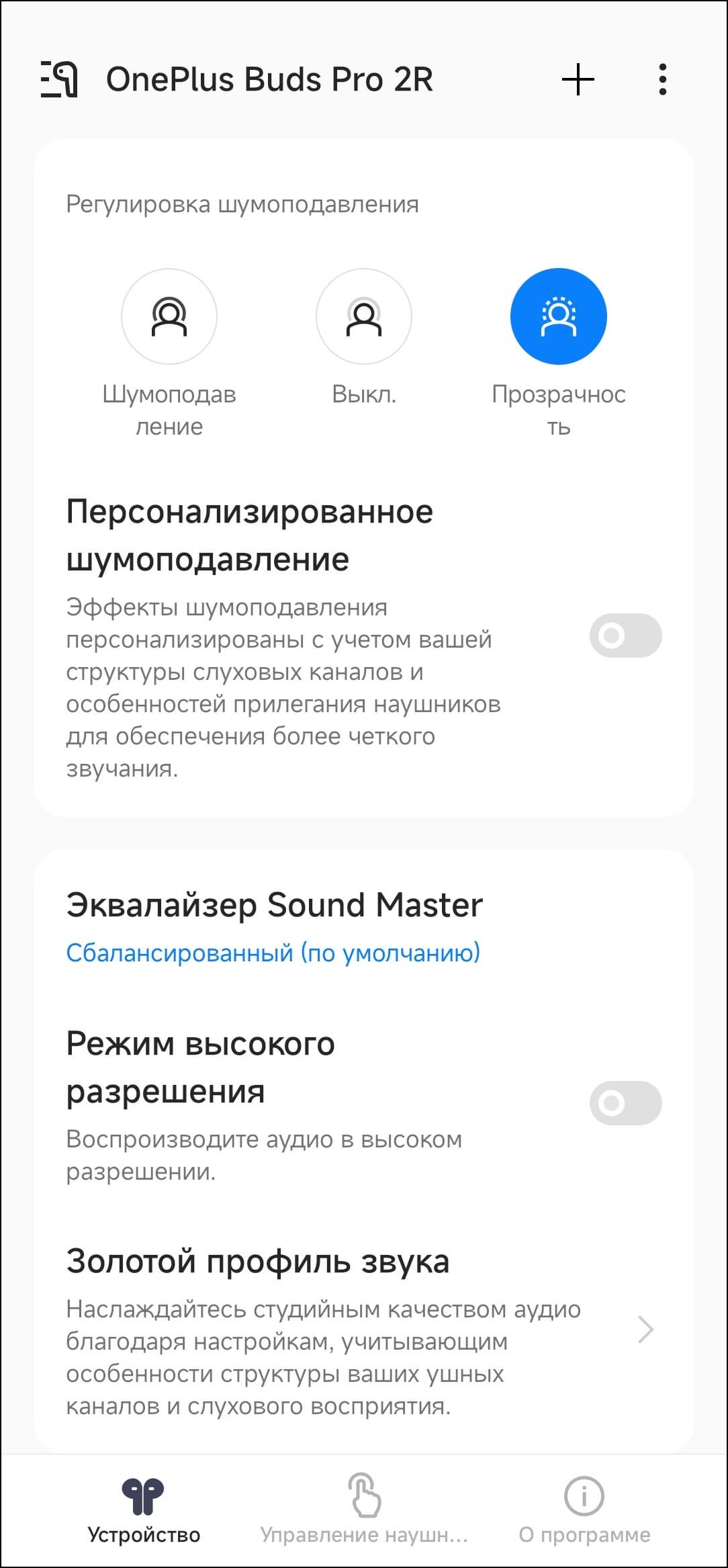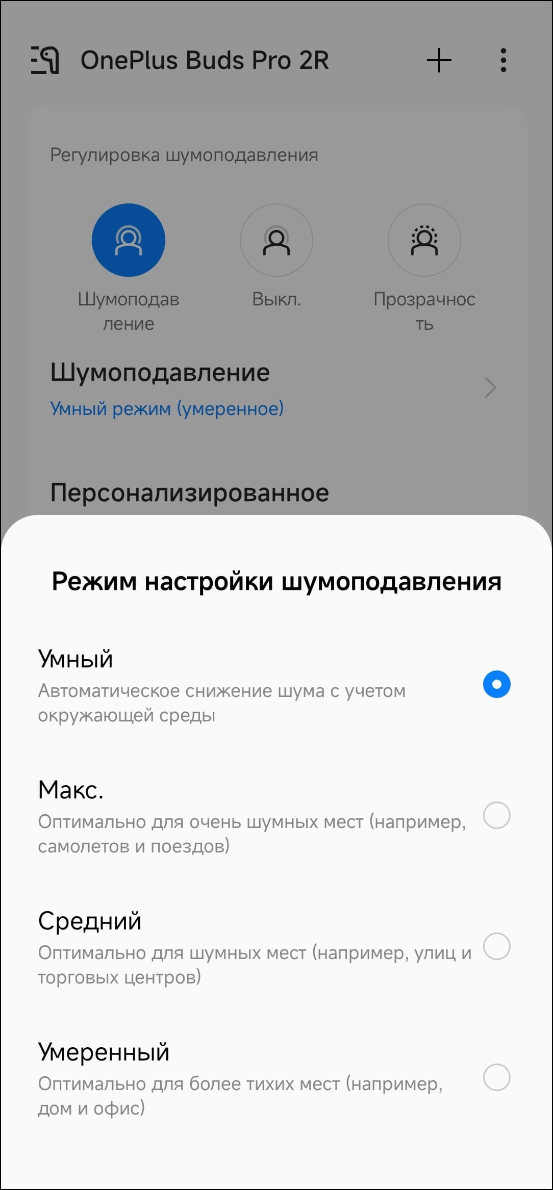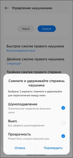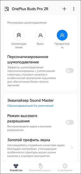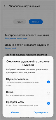 В список переключения режимов работы «шумодава» входят всего три пункта: включено, выключено и «прозрачность», выбирать режим работы придется через приложения. Зато любой из пунктов можно исключить из списка, если он не используется.