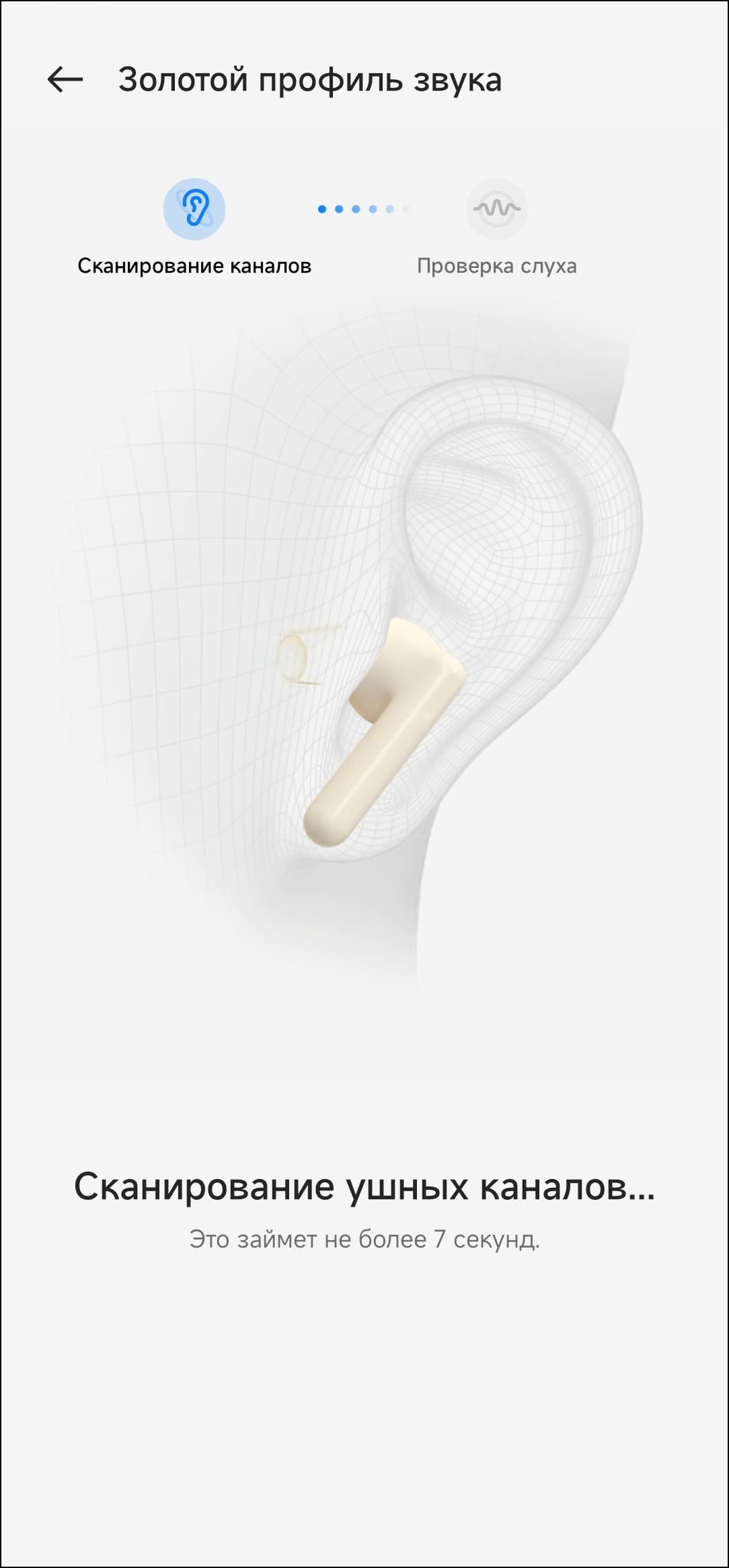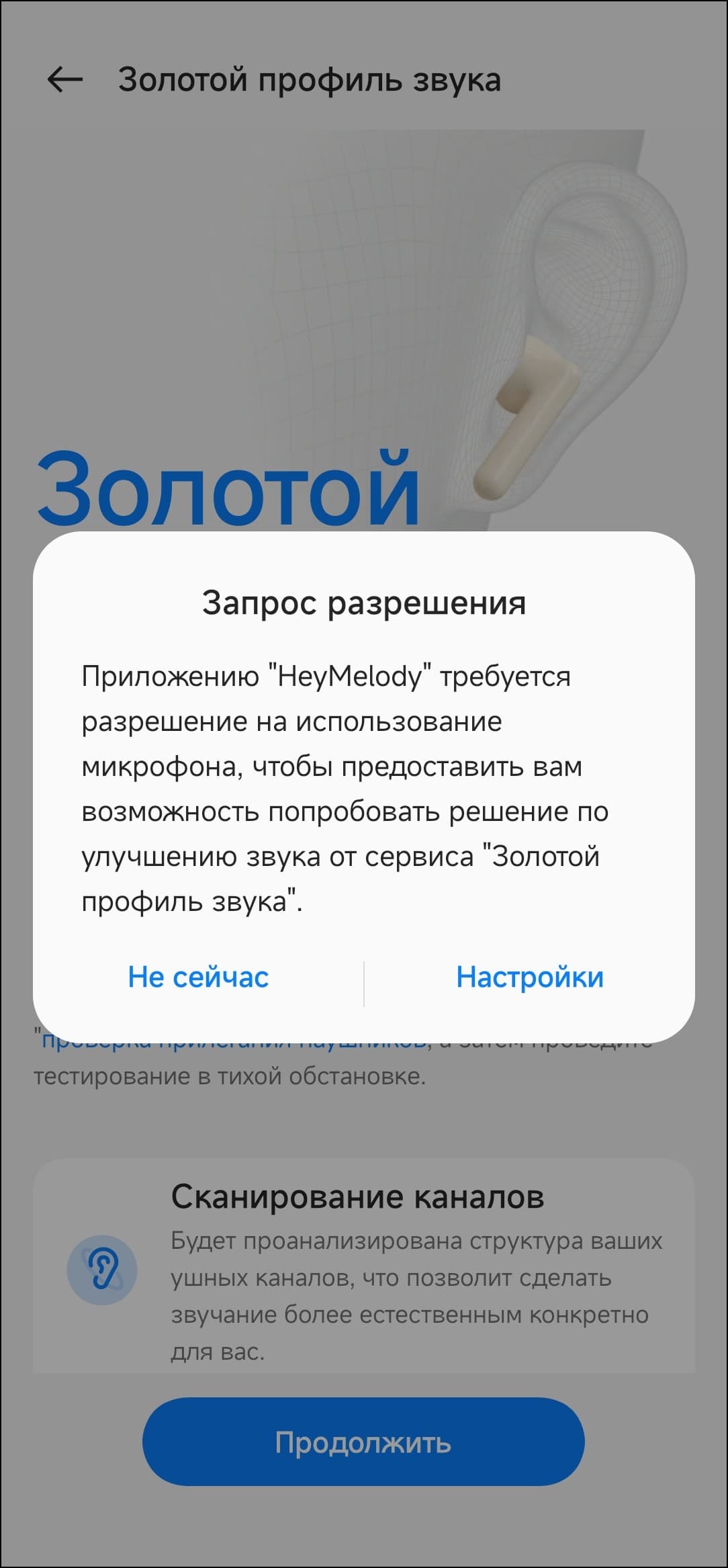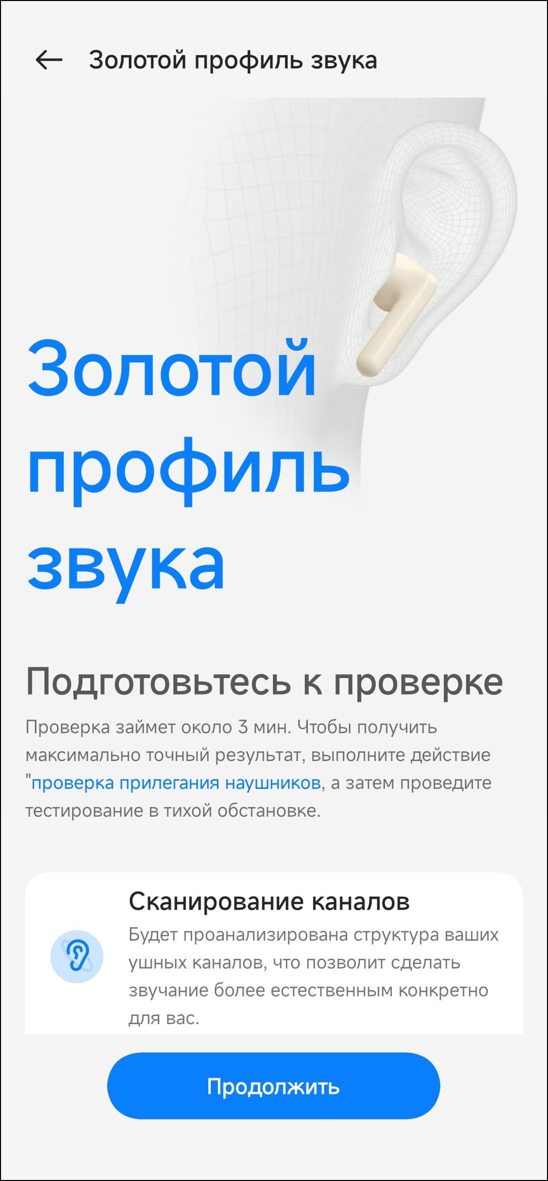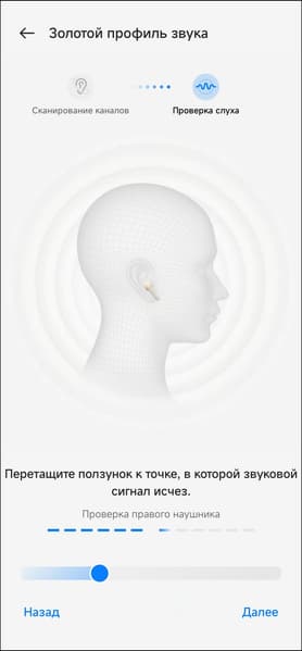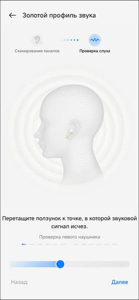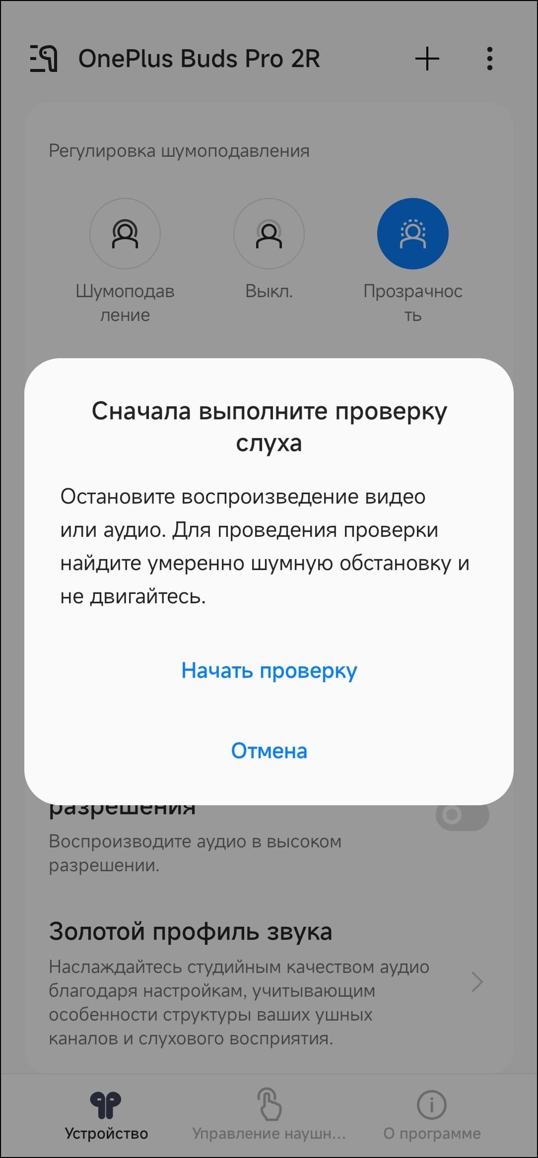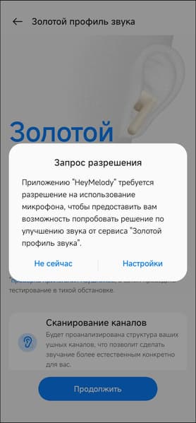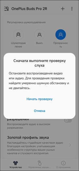 Далее следует еще одна опция подстройки звука OnePlus Buds Pro 2R под пользователя — создание так называемого «золотого профиля звука». После запуска система просит пару-тройку разрешений, потом предлагает подготовиться к проверке слуха.