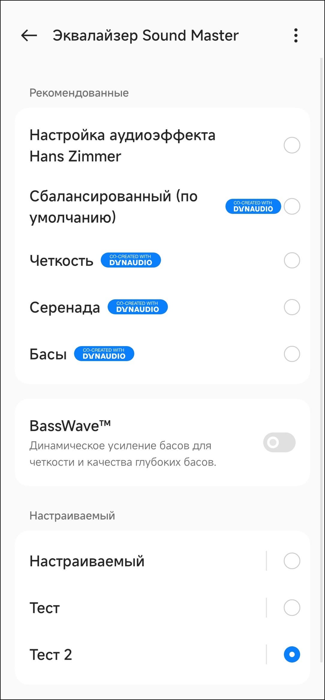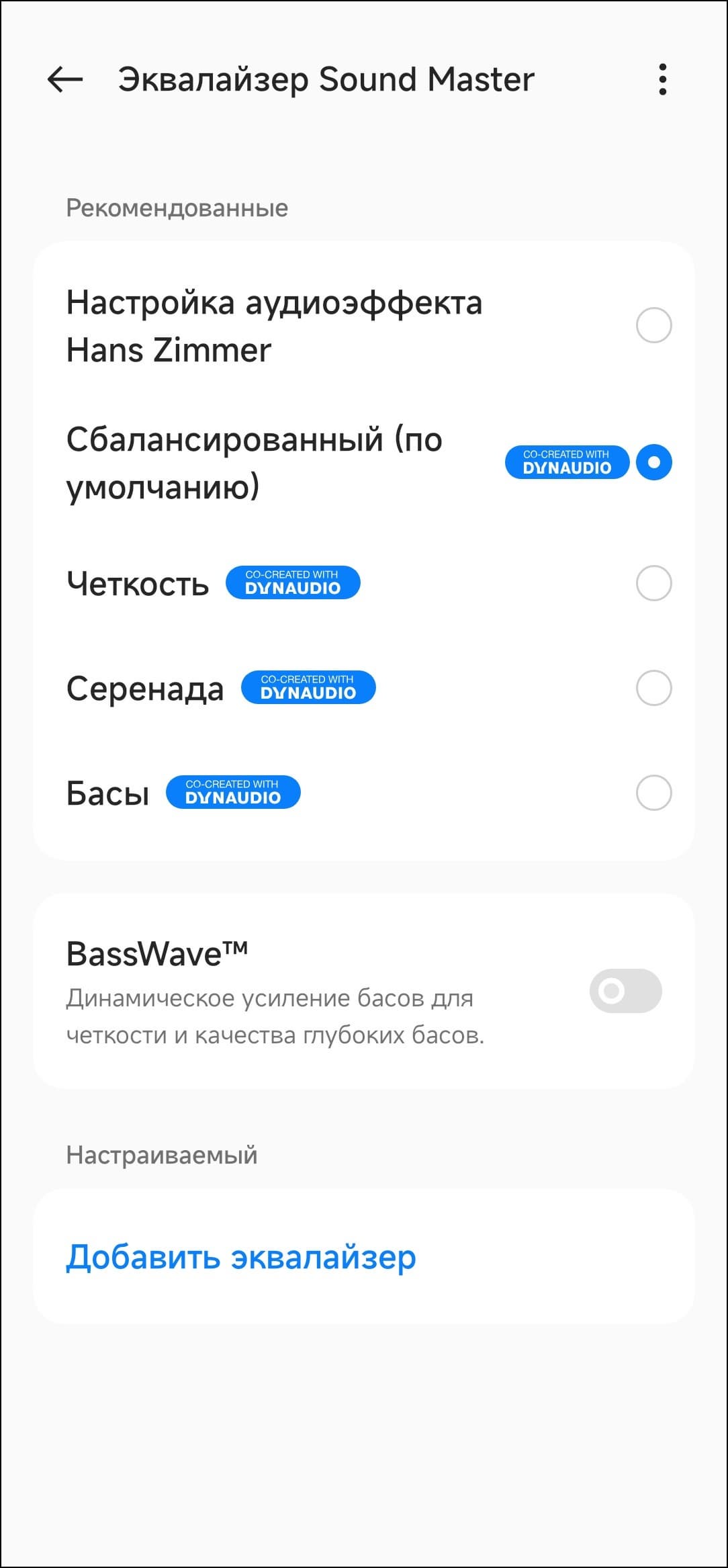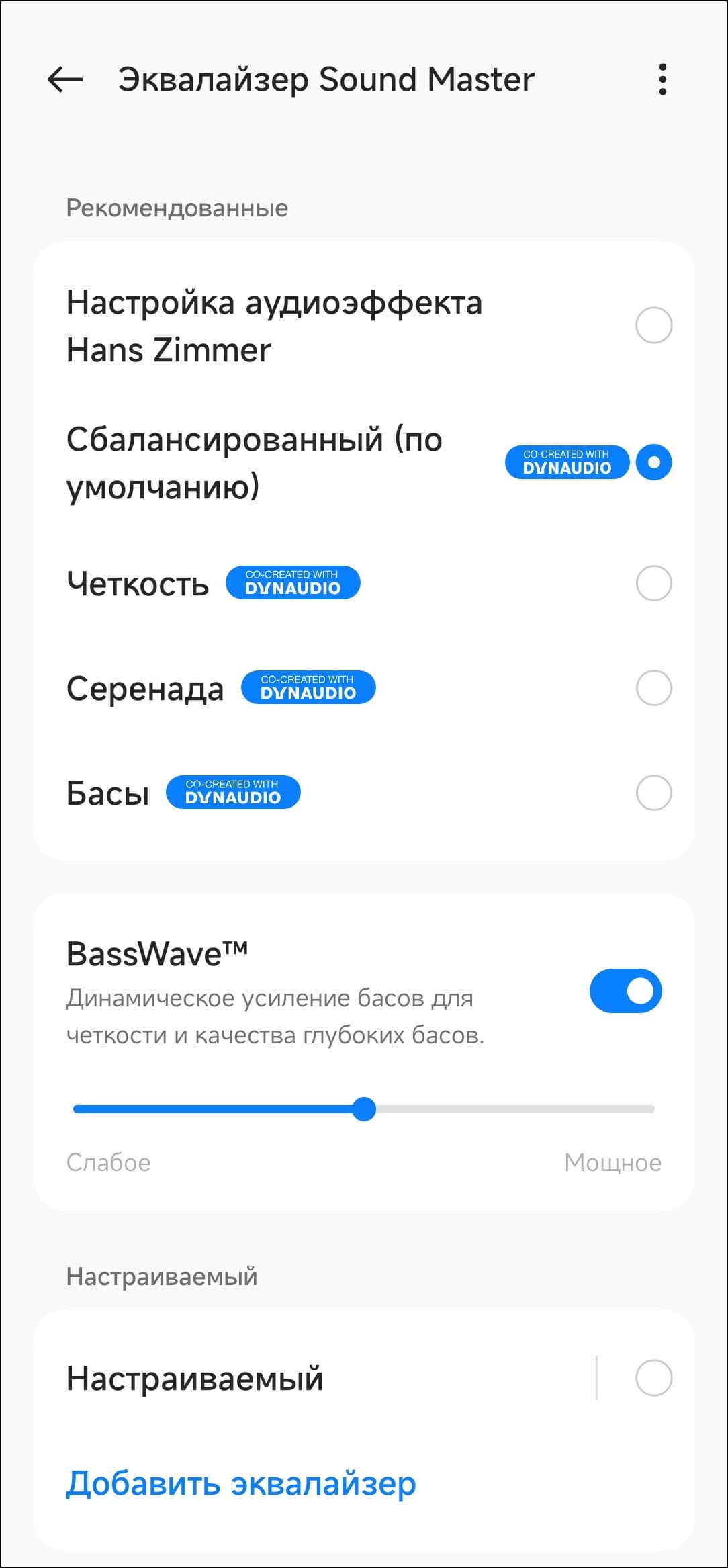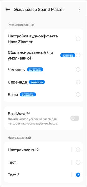 OnePlus Buds Pro 2R поставляется с пятью пресетами эквалайзера, среди которых — тот самый, что был создан Хансом Циммером. Функция BassWave динамически изменяет акцент на НЧ-диапазоне, смещая его в зависимости от яркости басовой партии в треке. При этом пользователю дается возможность плавно изменять степень «усиления» баса.