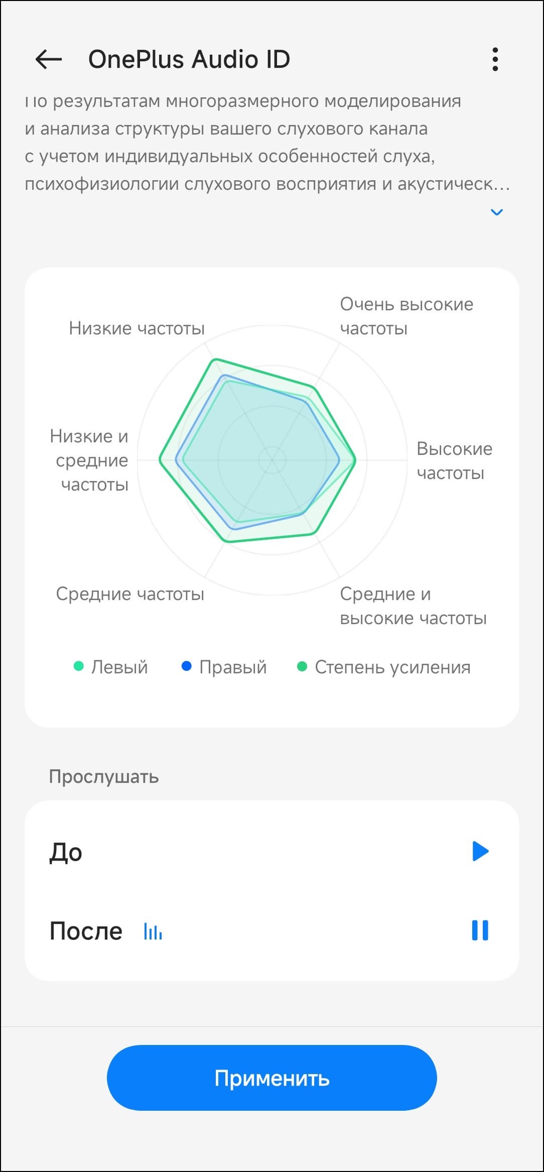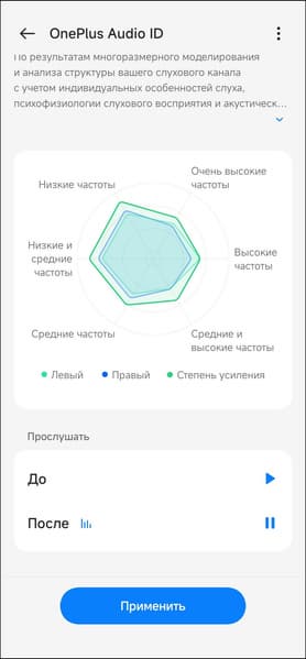 Далее на основании полученных данных создается профиль эквализации, где подчеркнуты те частоты, чувствительность к которым у слушателя снижена. Проверить то, как это всё работает, можно тут же, послушав приятную мелодию, звучащую с задействованным эквалайзером и без него. Профилей может быть несколько — каждый для своего пользователя. Либо обработку можно вообще отключить, что мы и сделали перед тем, как перейти к дальнейшему тестированию и измерениям.