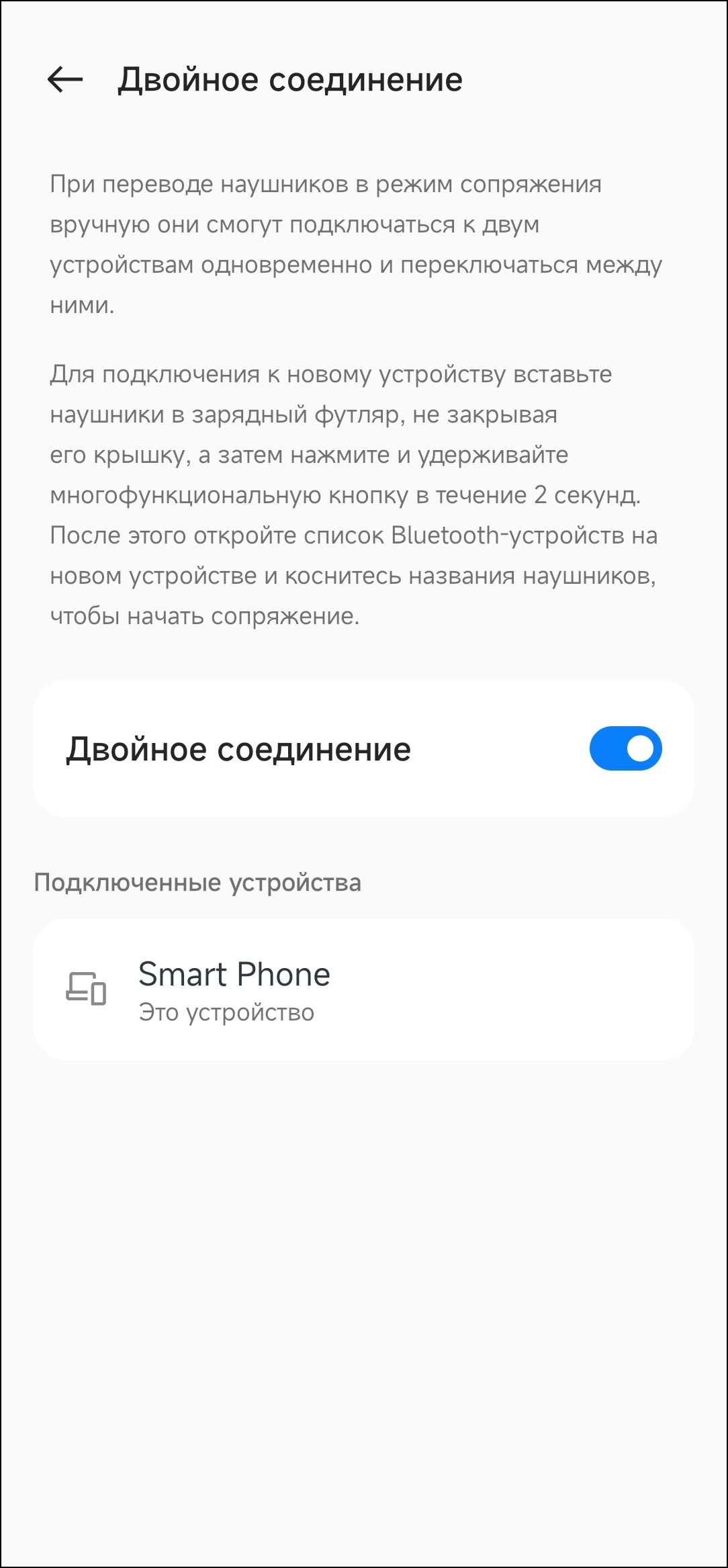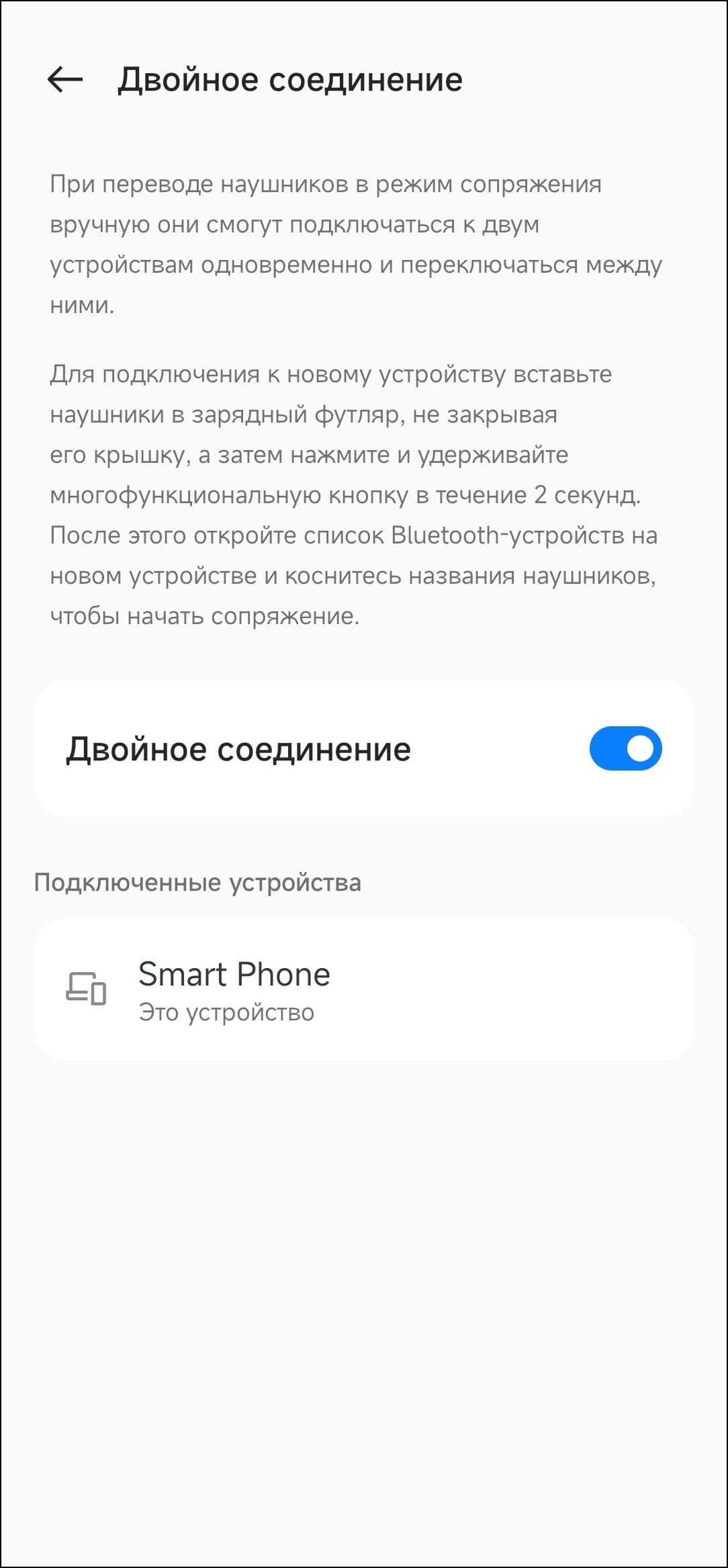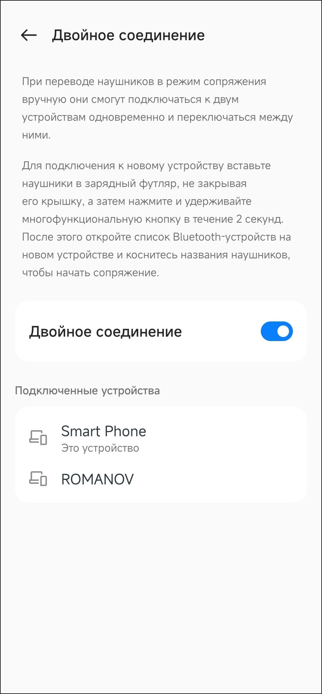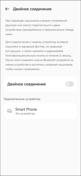 Далее можно задействовать игровой режим, который снижает задержку и предотвращает «рассинхроны» картинки и звука в играх или при просмотре видео. Как уже говорилось выше, особой необходимости мы в нем не почувствовали, пока не включили режим повышенного качества звука. Мультипойнт, названный здесь «двойное соединение», нужно активировать отдельным выключателем. Ну а далее всё просто — нажимаем кнопку внутри кейса, переходим в режим сопряжения, подключаем еще один источник звука.