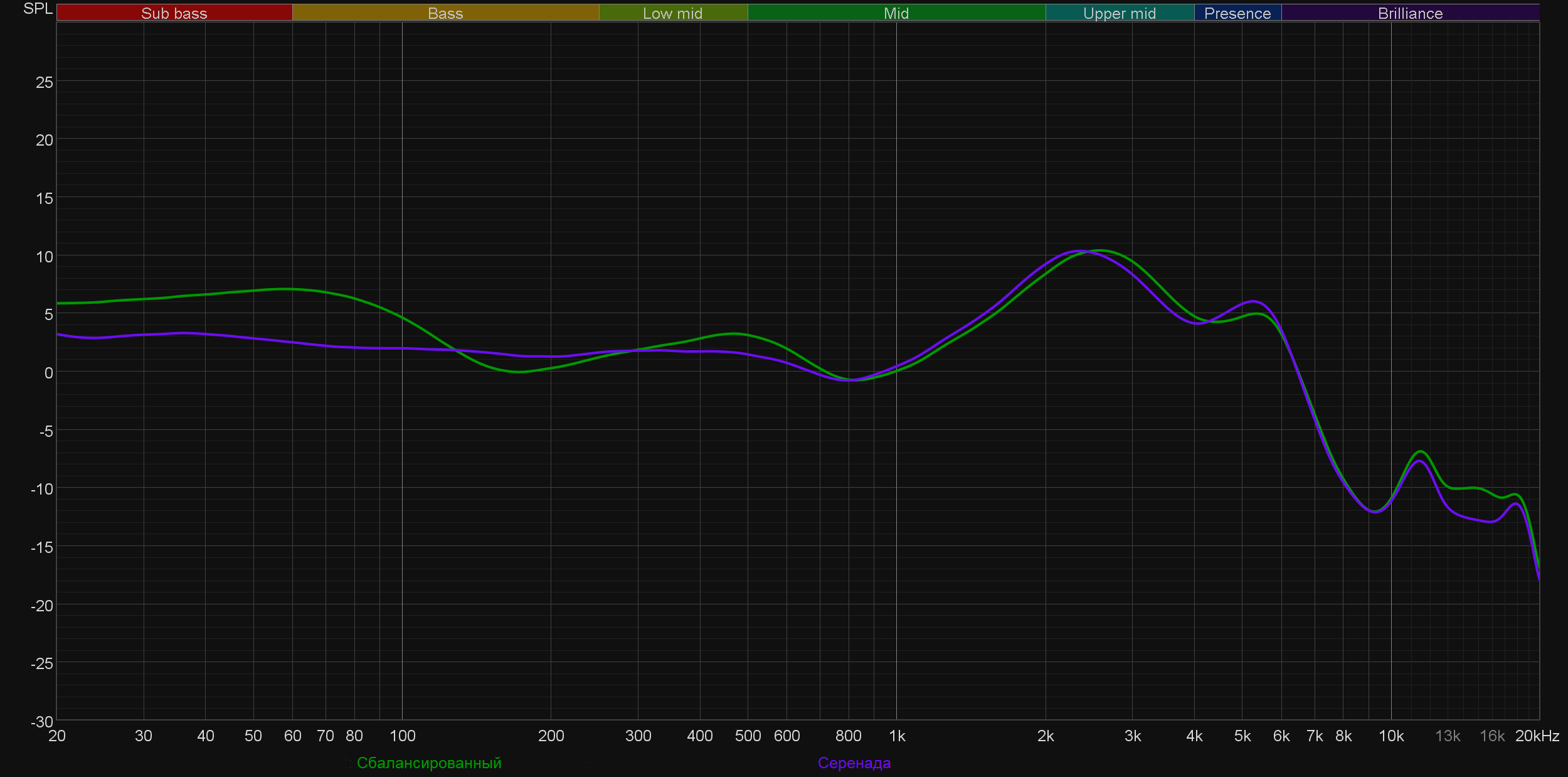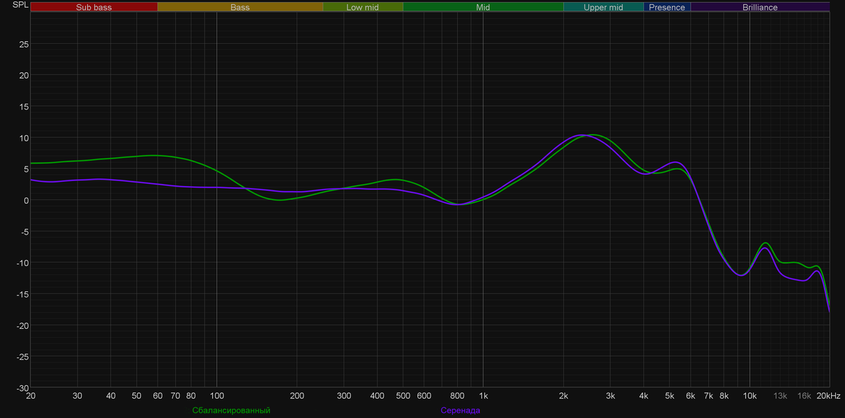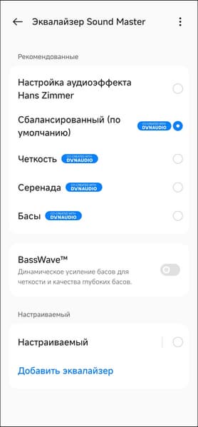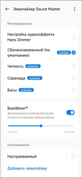 Остальные три профиля работают деликатно и делают ровно то, что можно было предположить по их названию: «Четкость» добавляет немного верхней середины, «Серенада» убирает акцент на басах, а «Басы», напротив, еще больше форсирует звучание НЧ-регистра.