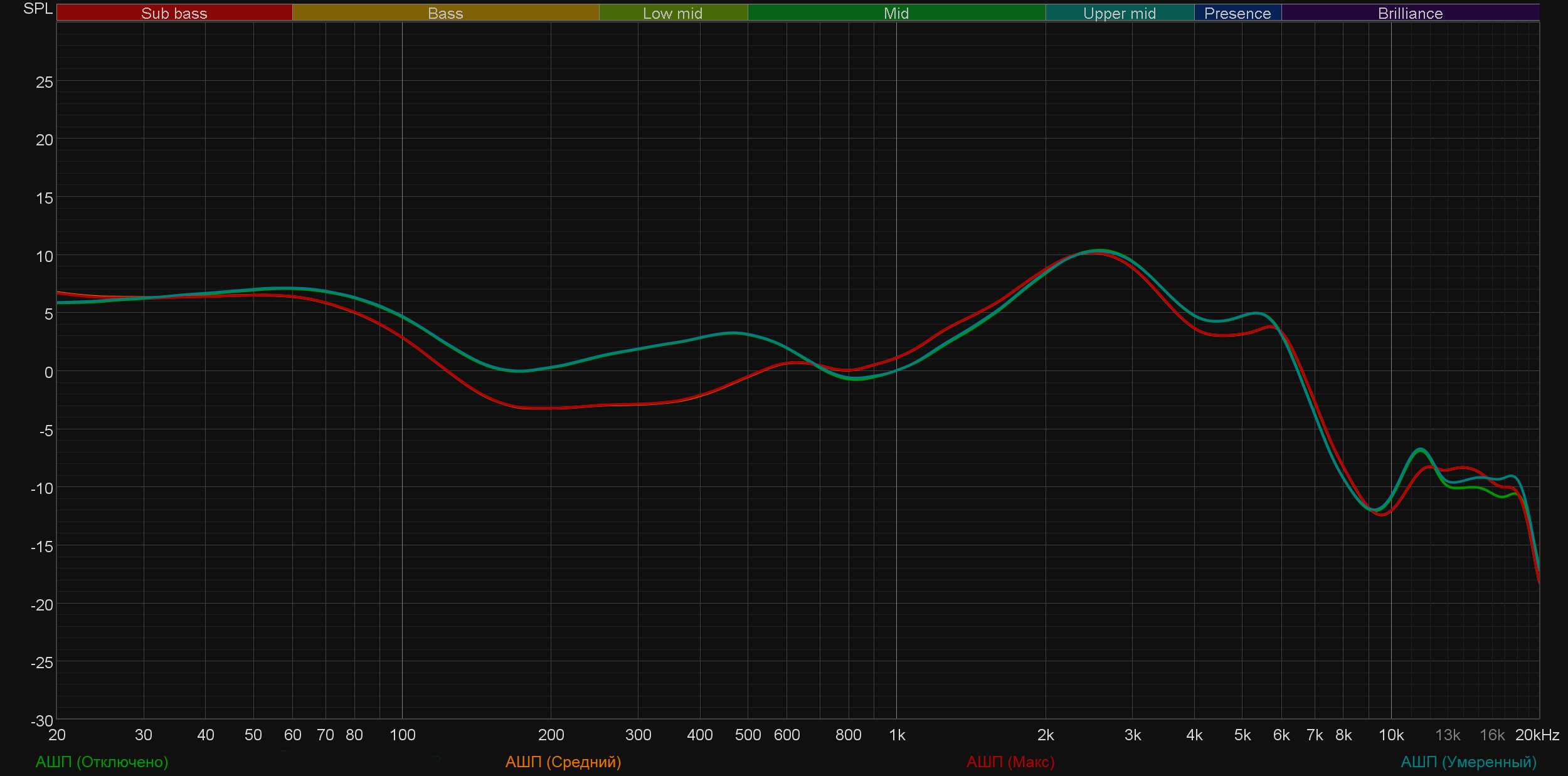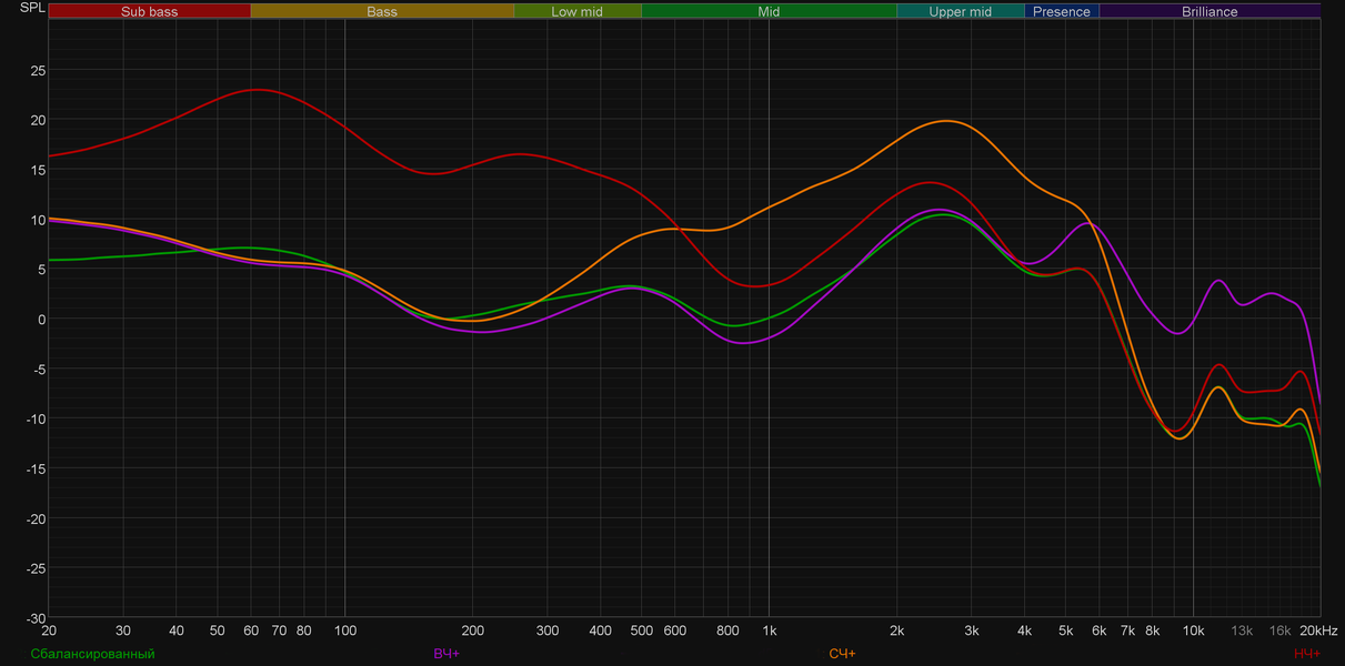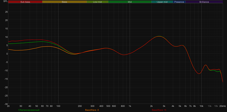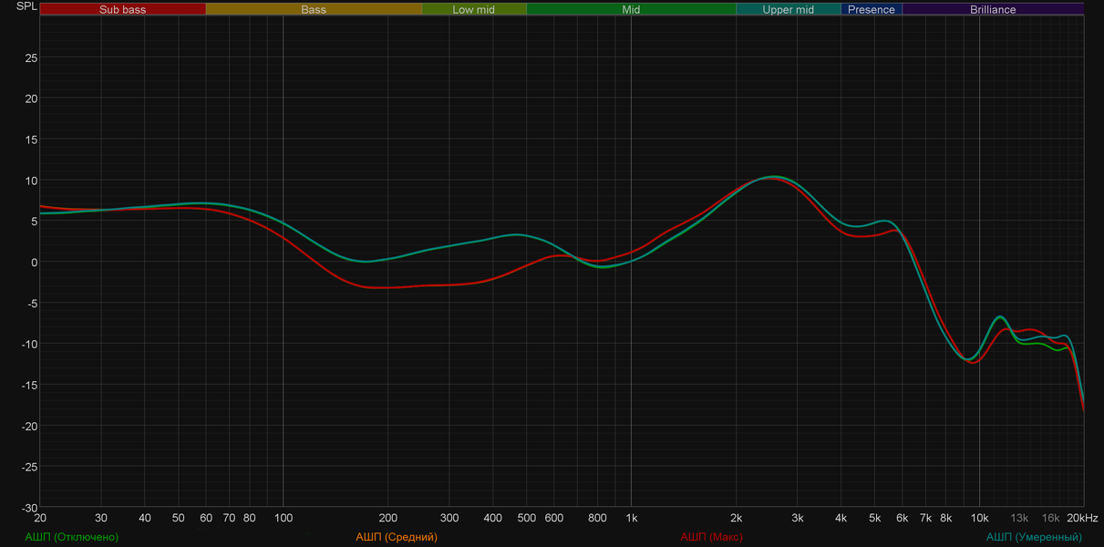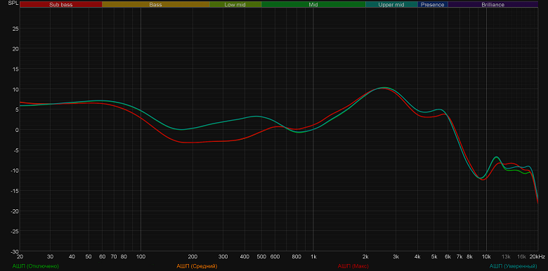 Как уже говорилось выше, предустановленные профили эквалайзера работают крайне деликатно. А вот вручную можно изменить звучание гарнитуры до неузнаваемости. Попробуем выкрутить на максимум последовательно высокие, низкие и средние частоты. «Горбы» на графике ясно показывают нам, что эффект от этих действий есть. При этом даже такие «экстремальные» настройки не привели к возникновению слышимых искажений.