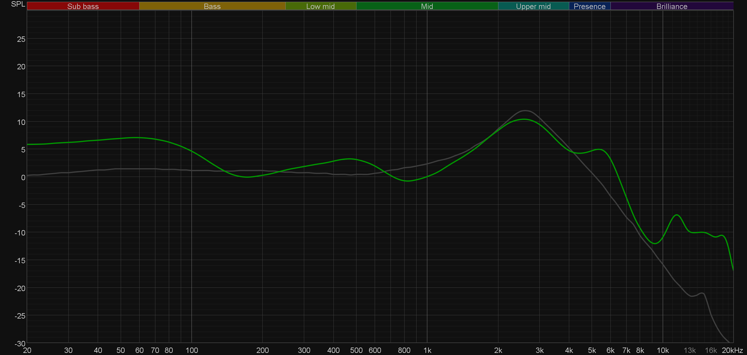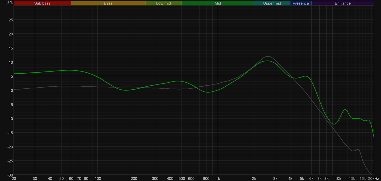 График выше показан на фоне кривой IDF (IEM diffuse field compensation), предоставленной производителем используемого стенда. Ее задача — помочь скомпенсировать резонансные явления в имитированном слуховом канале и особенности оборудования, создав «звуковой профиль», максимально корректно иллюстрирующий то, как звучание наушников воспринимается слушателем. Ее можно рассматривать как адаптированный под конкретное устройство аналог так называемой «кривой Хармана», созданной командой Harman International под руководством доктора Шона Олива. Скомпенсируем полученный график АЧХ в соответствии с кривой IDF.