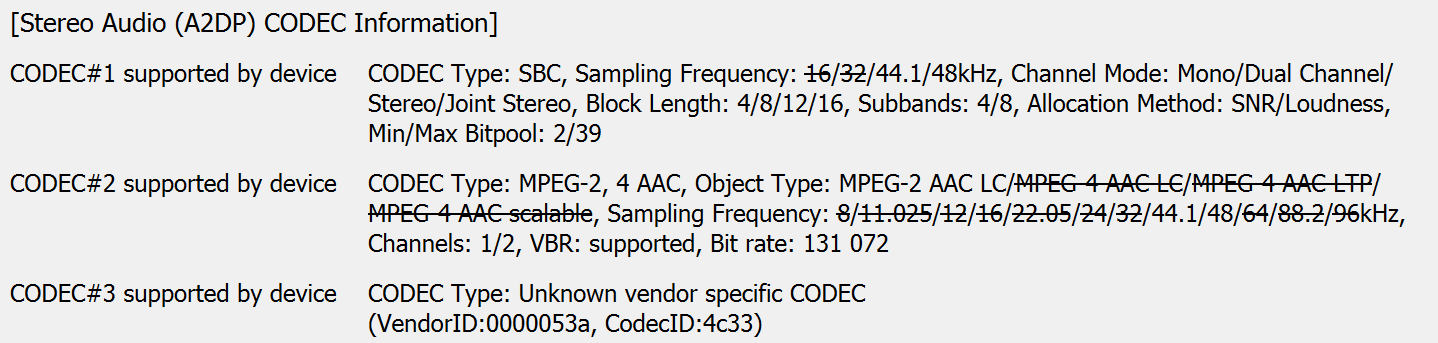 Полный список поддерживаемых кодеков и их режимов мы традиционно получили с помощью утилиты Bluetooth Tweaker. Два базовых кодека — SBC и AAC — программа определила, ну а третий, судя по ID, это как раз заявленный LHDC. Очень интересный «продвинутый» кодек, поддерживающий динамическую смену битрейта вплоть до верхней границы 990 Кбит/с и потенциально обеспечивающий передачу аудиоданных в высоком качестве. Поддерживается он пока далеко не всеми смартфонами, но многими — как минимум, последними моделями Huawei, Oppo, OnePlus и Xiaomi.