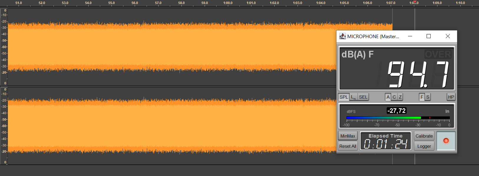 Ну а дальше всё как обычно. Безопасным уровнем звукового давления при прослушивании музыки считается 75 дБ, но на практике большинство слушателей предпочитает уровень 90-100 дБ. Мы транслируем в наушники белый шум, фиксируя уровень SPL в районе 95 дБ, сразу после старта воспроизведения запускаем запись сигнала с измерительного стенда — по длине получившегося трека легко понять, сколько проработал каждый из наушников.