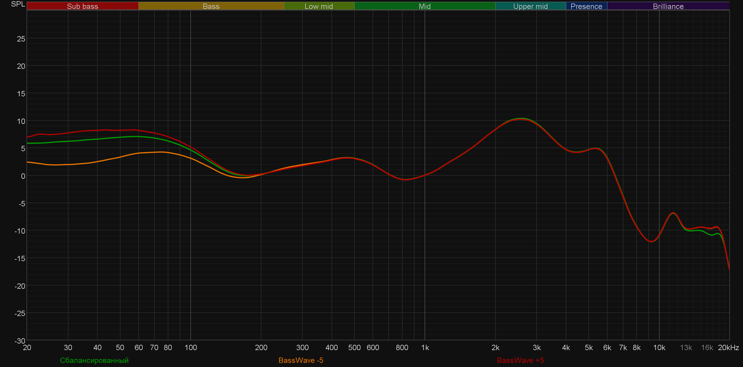 Алгоритм BassWave динамически изменяет звучание НЧ-диапазона, рассматривать его лучше на реальном музыкальном материале, а не на свип-тоне. Но всё же видно, что он работает.
